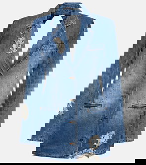 Featuring notch lapels and a streamlined single-button silhouette, this blazer is crafted with comfortable dark-rinse denim for an effortless take on a smart dressing staple. Princess seams, front waist darts and signature horn-effect buttons offer tailored appeal.