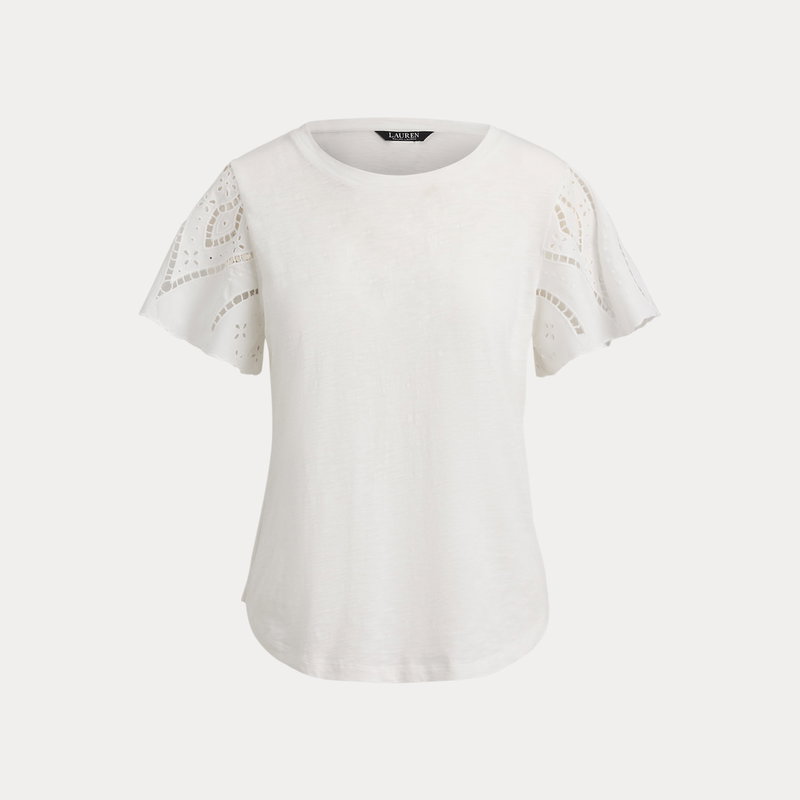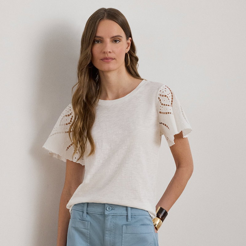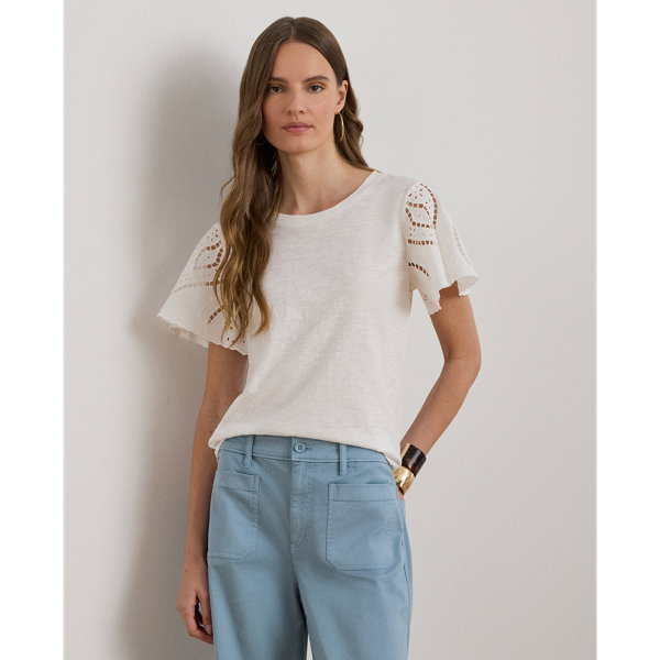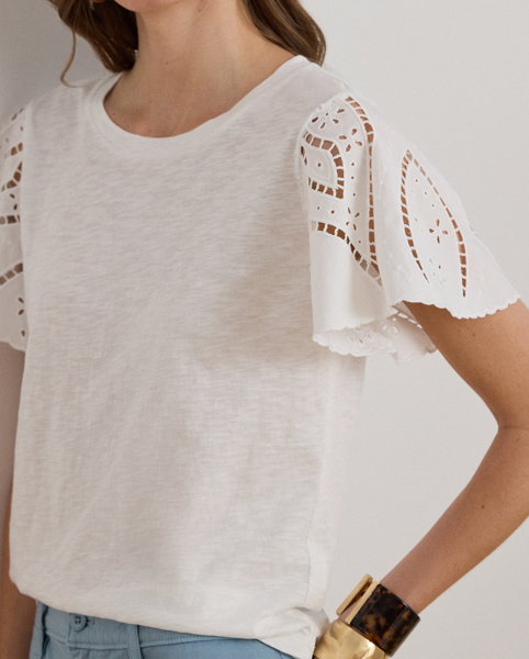 This effortless cotton jersey top features a relaxed silhouette and broadcloth flutter sleeves with eyelet embroidery and scalloped edges.