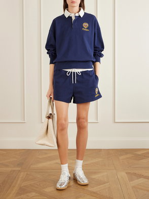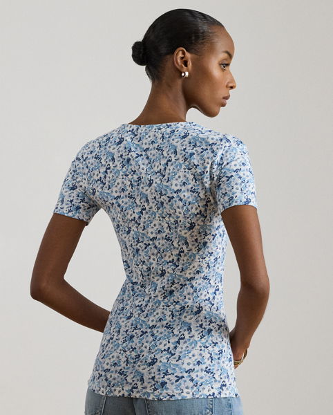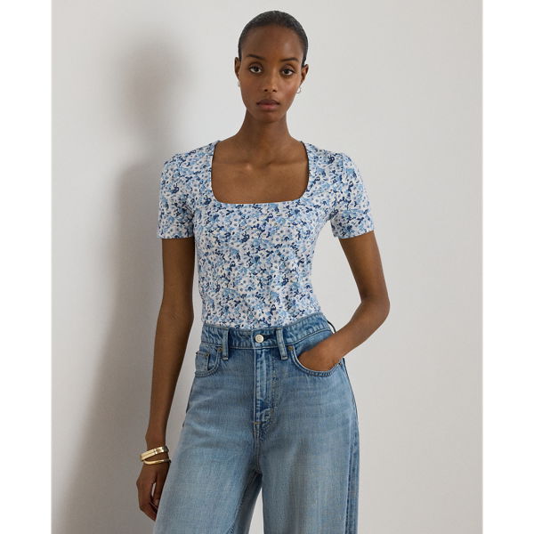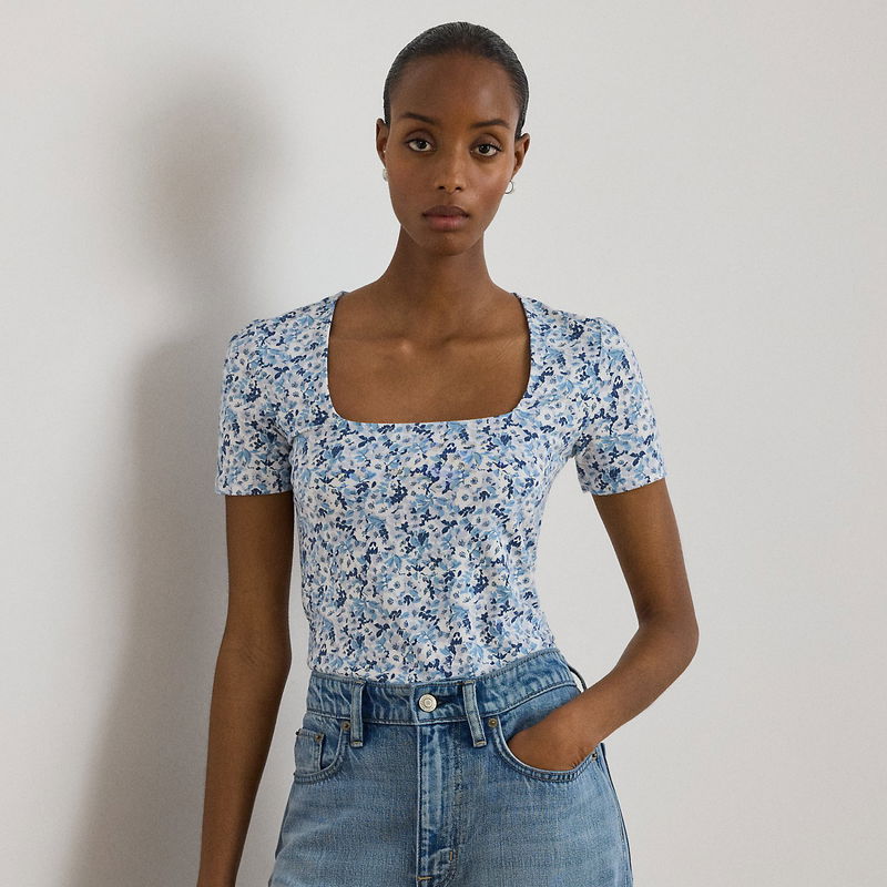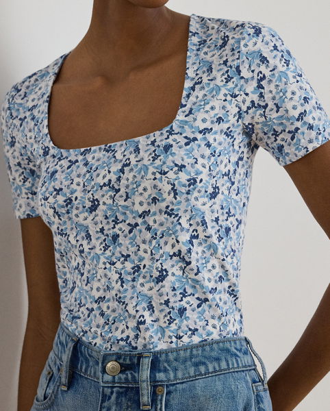 Crafted from stretch cotton jersey, this short-sleeve top features a square neckline and an enchanting floral motif in blue and white hues.