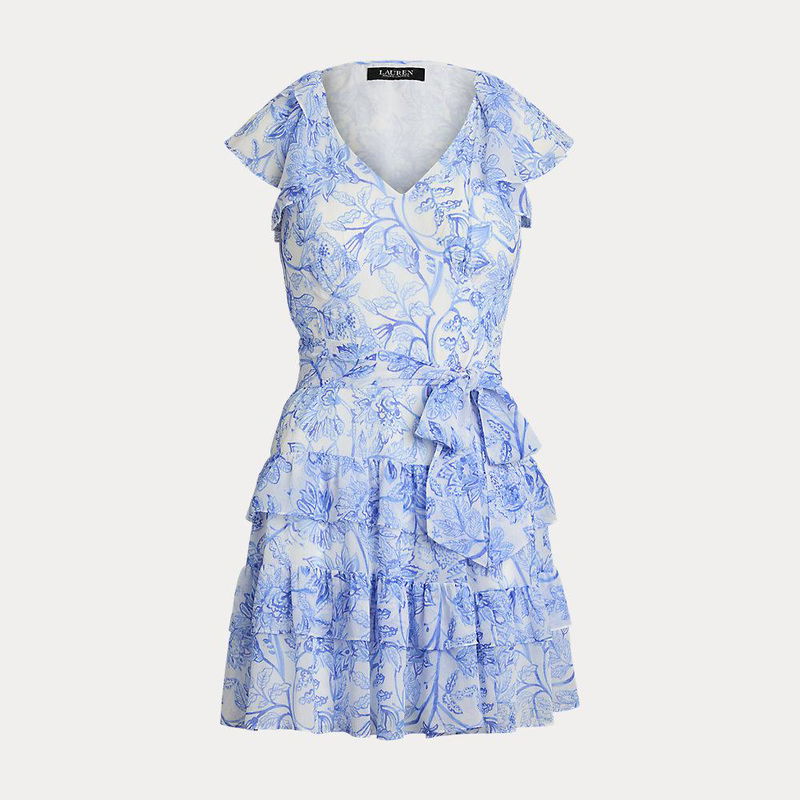 Crinkle georgette and a ruffle-trimmed tiered skirt bring effortless movement to this belted flutter-sleeve dress, which displays a blue and white floral motif rendered in the style of an ink sketch.