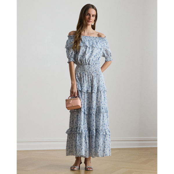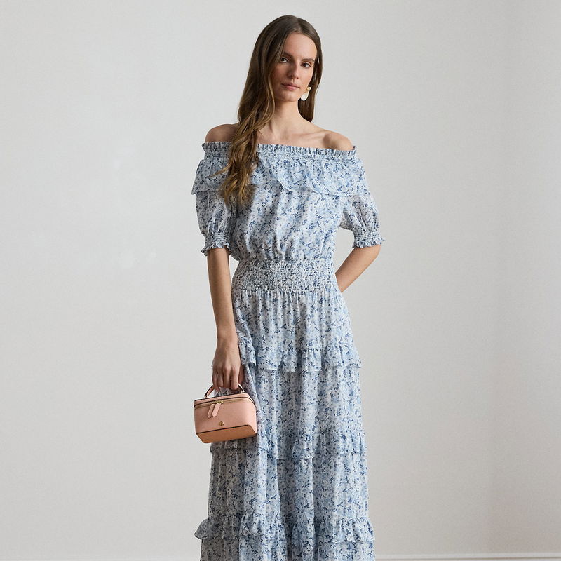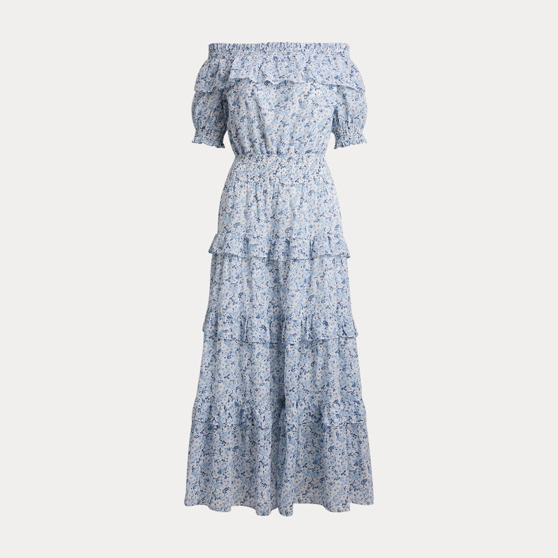 This off-the-shoulder midi dress exudes romance with smocked puffed sleeves, seasonal florals and a ruffle-trimmed tiered silhouette rendered in airy cotton voile.