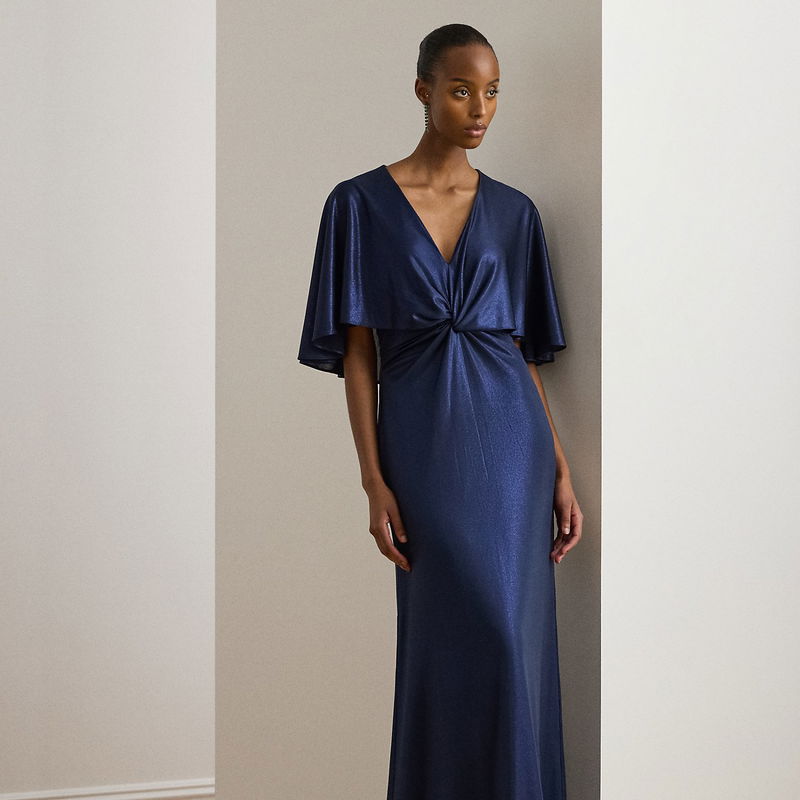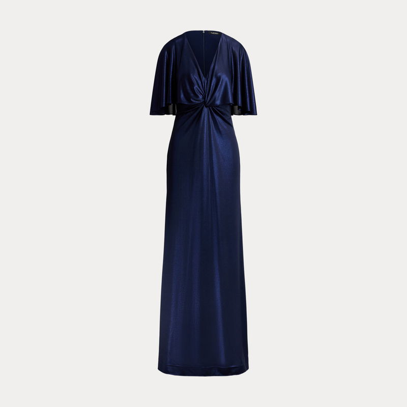 Metallic Jersey Twist-Front Cape Gown