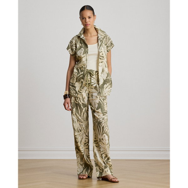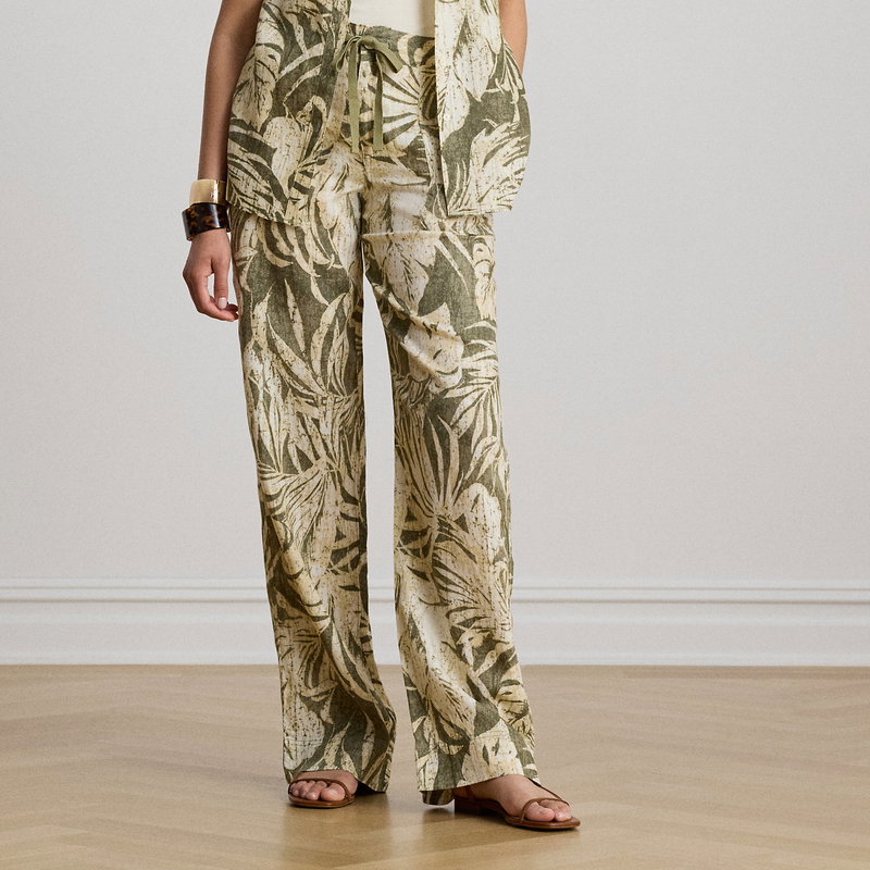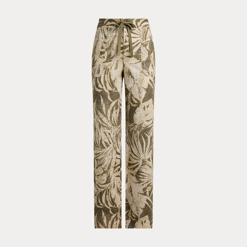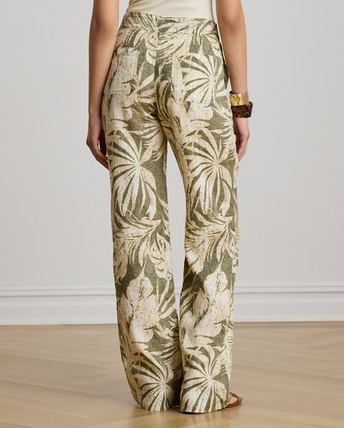 Palm Frond-Print Linen Wide-Leg Trousers