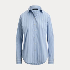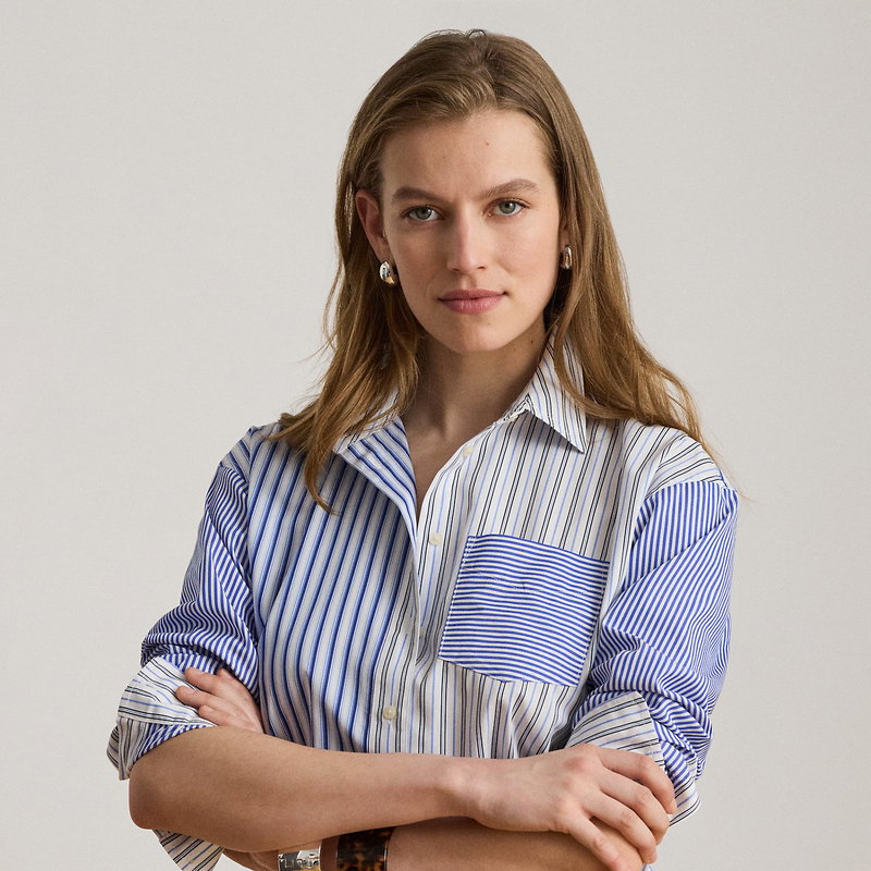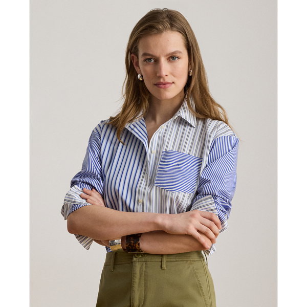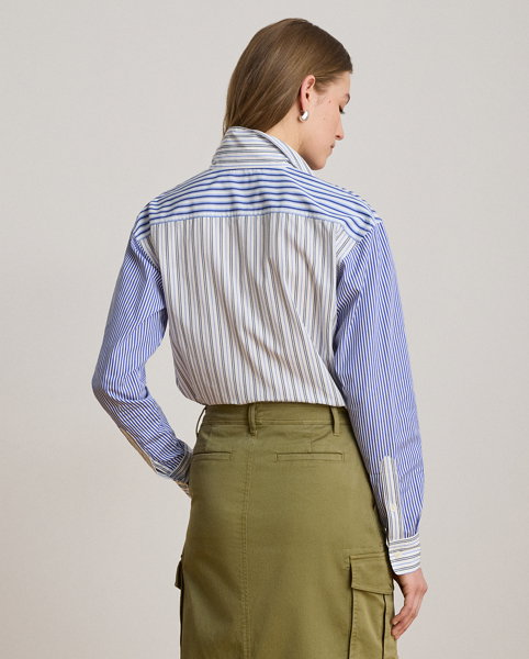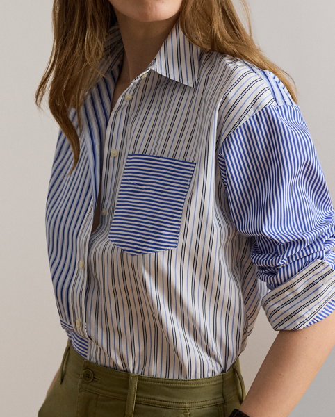 Rendered in crisp cotton broadcloth, this collared shirt unites a relaxed silhouette with a pattern-blocked motif of varying yarn-dyed stripes. Signature buttons complete the look.