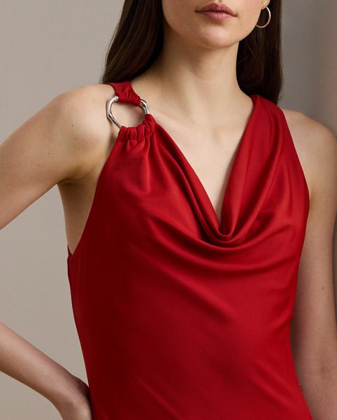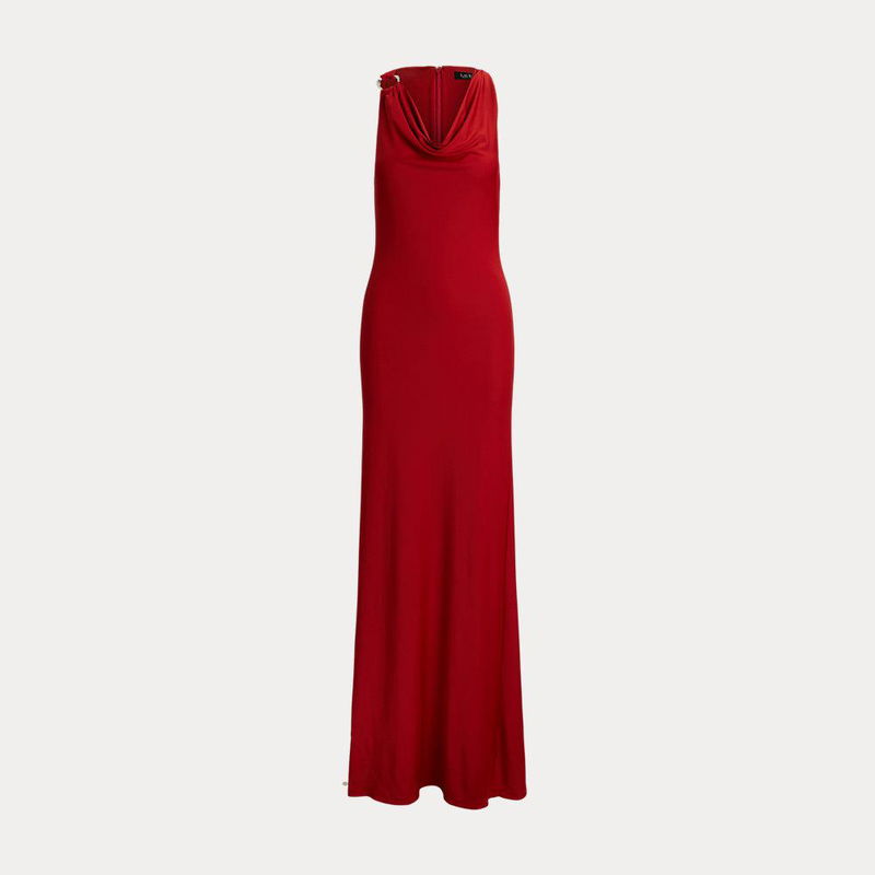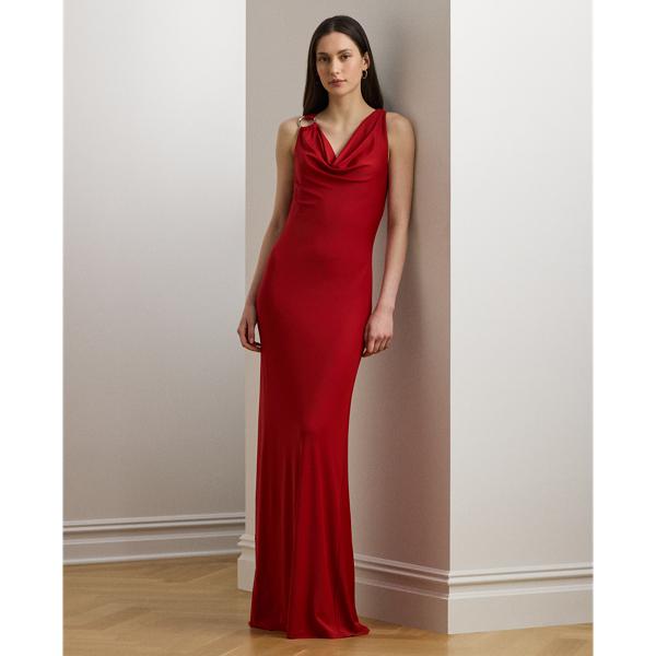 Featuring a cowlneck design and a textured, bamboo-inspired O-ring at the right strap, this elegant floor-length gown is realised in stretch-infused jersey for a fluid drape.