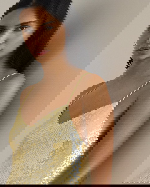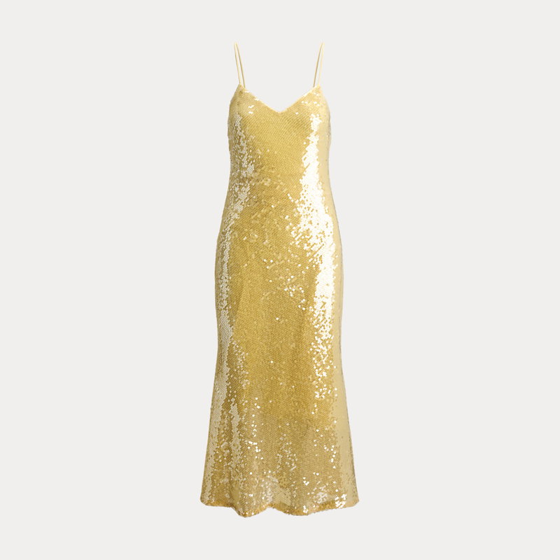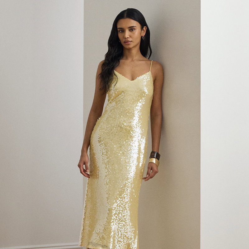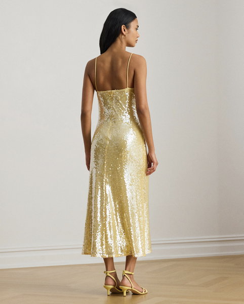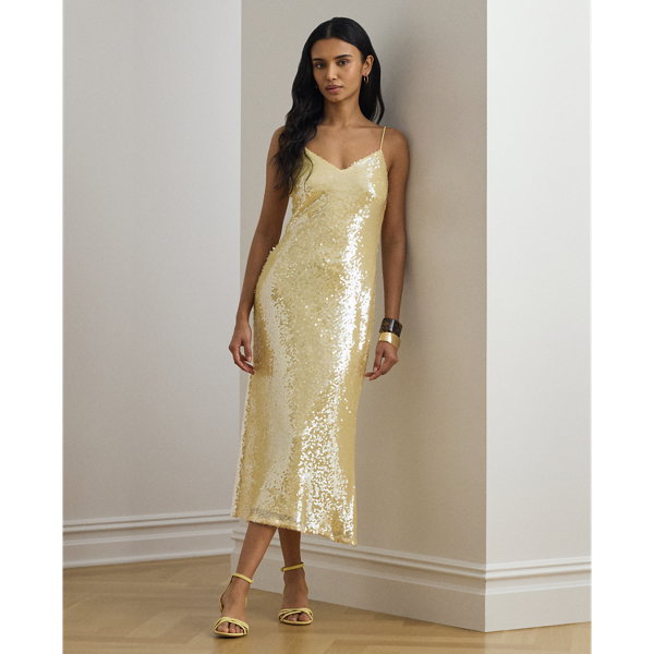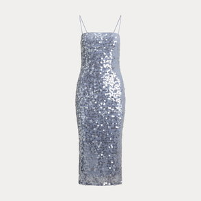 This captivating sleeveless cocktail dress showcases a fluid slip silhouette realised in sequined tulle for a luminous finish.
