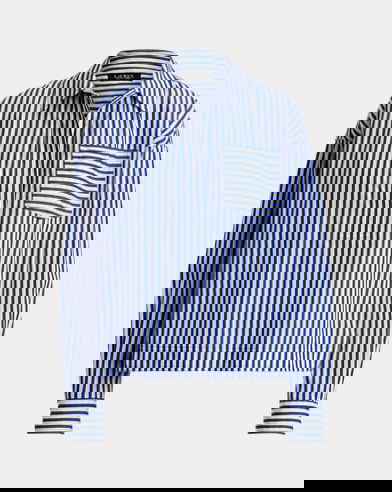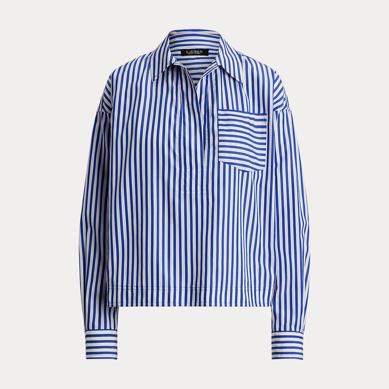 Tailored with crisp cotton broadcloth, this essential collared shirt features yarn-dyed stripes and a cropped, slightly boxy silhouette.