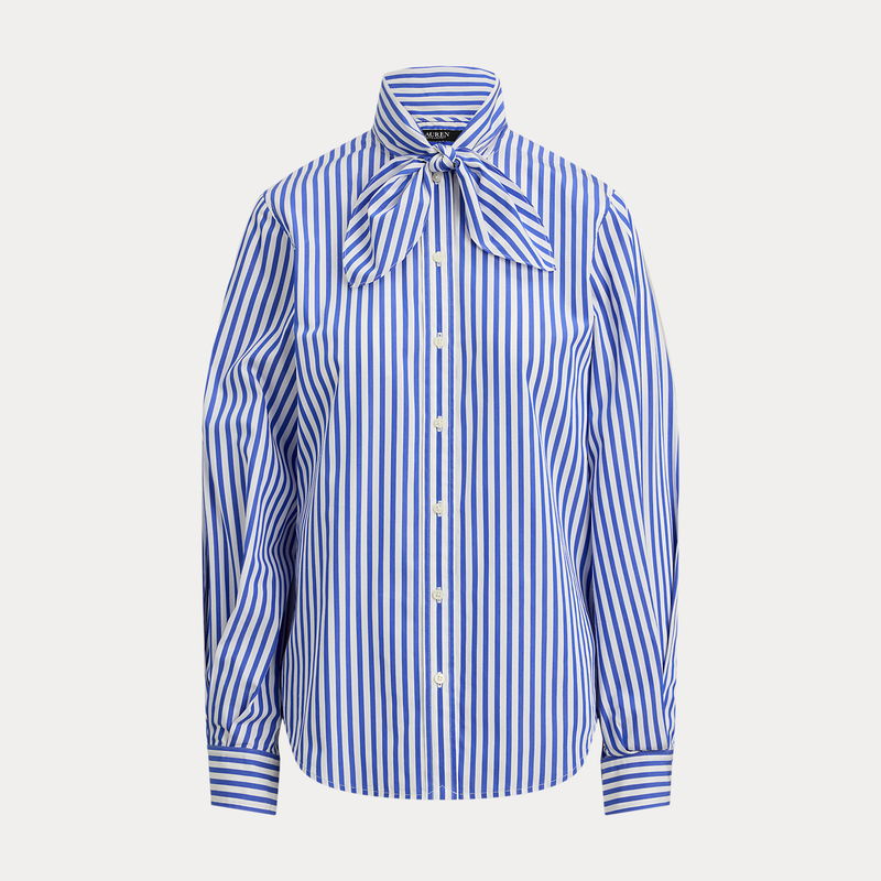 Striped Cotton Broadcloth Tie-Neck Shirt