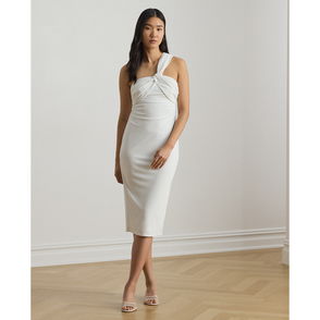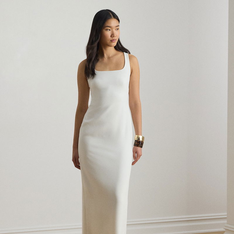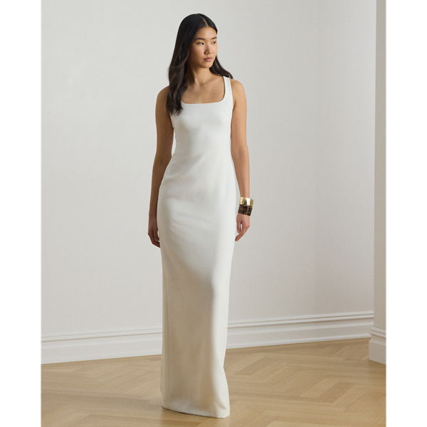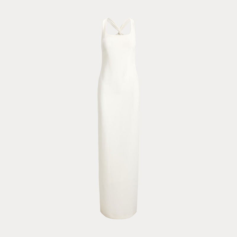 Rendered in smooth double-faced crepe, this gown's statuesque column silhouette is finished with a modern twisted detail at the back straps.