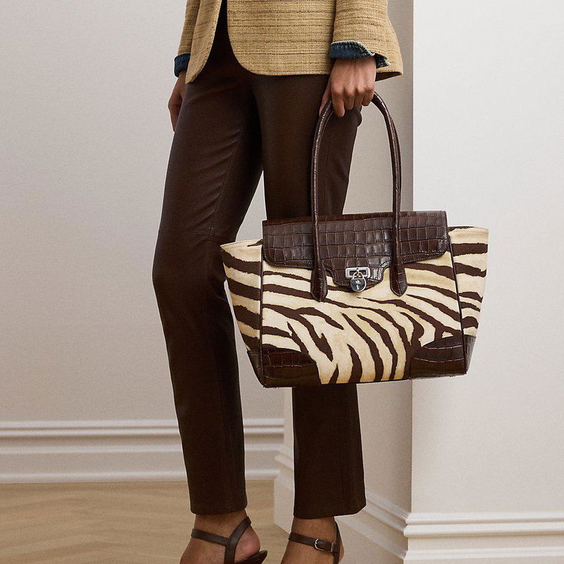 The perfect accessory to wear to the office or running errands, this bag pairs glossy crocodile-embossed leather with zebra-print canvas for luxurious appeal.