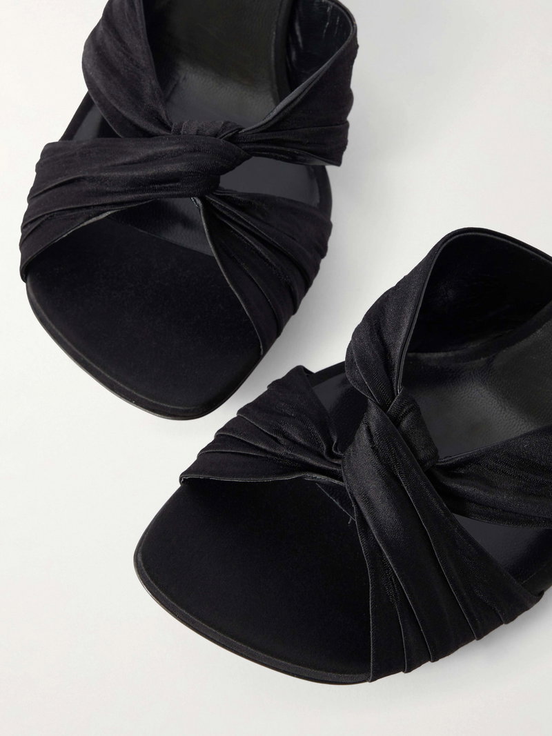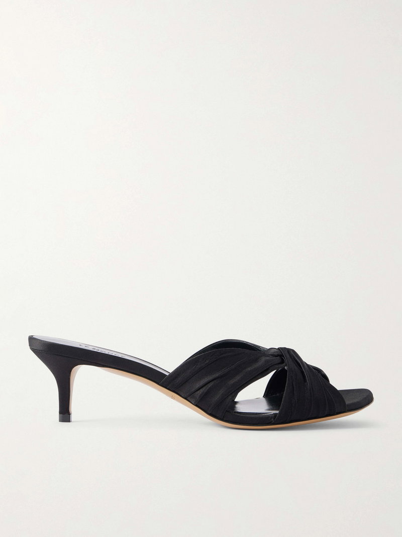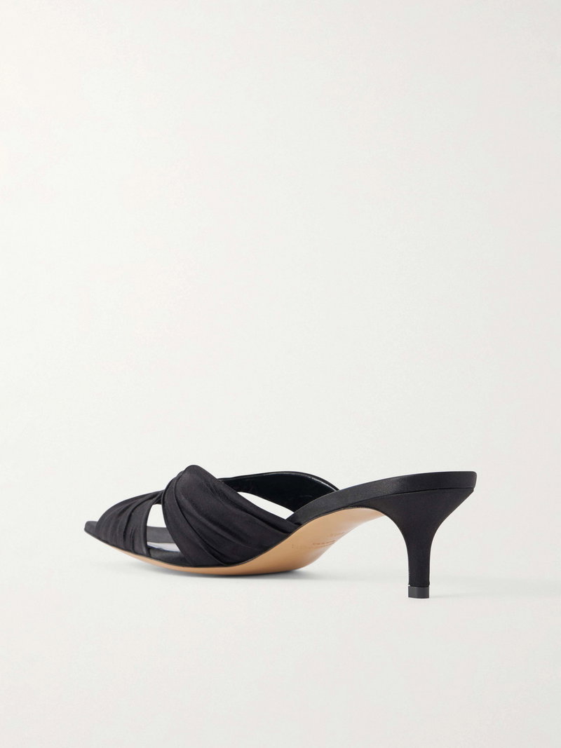 Le Monde Beryl's 'Antonia' kitten heel mules distill a romantic elegance. Set on a delicate 50mm heel, the silhouette remains pared back and precise, while the satin finish softens its structure with a gentle sheen. A subtle twisted vamp detail introduces a sense of movement and intrigue.
