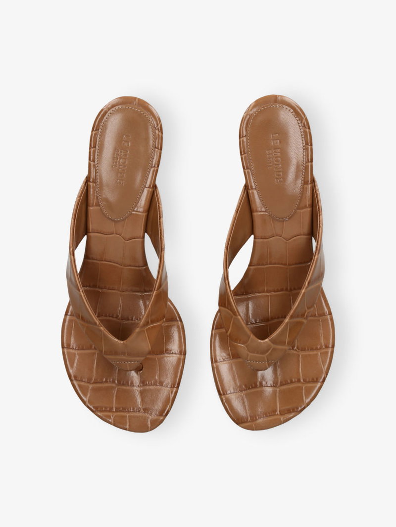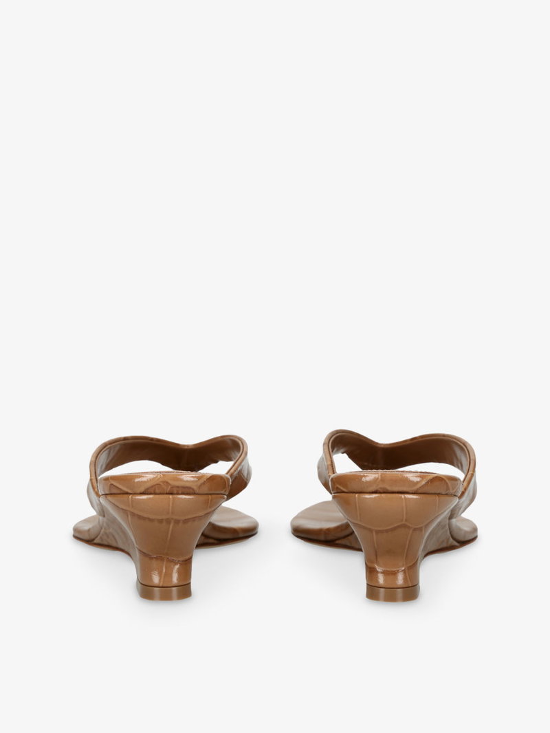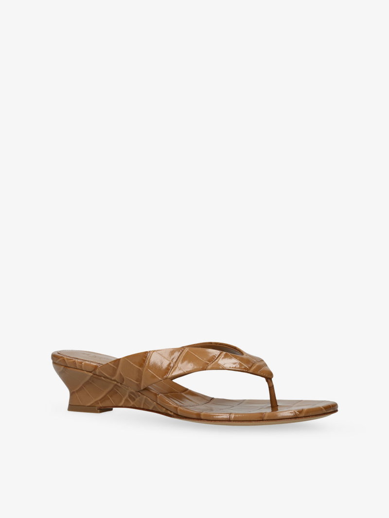 • Round open toe, toe post, crocodile-embossed upper, wedge heel