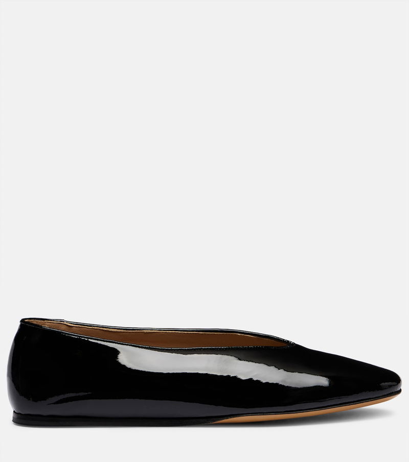 London-based brand Le Monde Béryl delivers modern interpretations of classic shoe styles. Made in Italy from black patent leather, the Regency ballet flats are characterized by almond-toed silhouettes.
