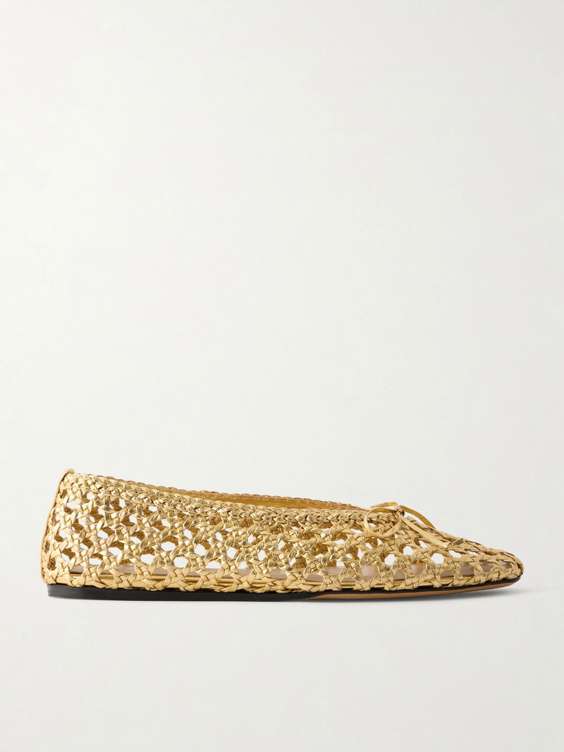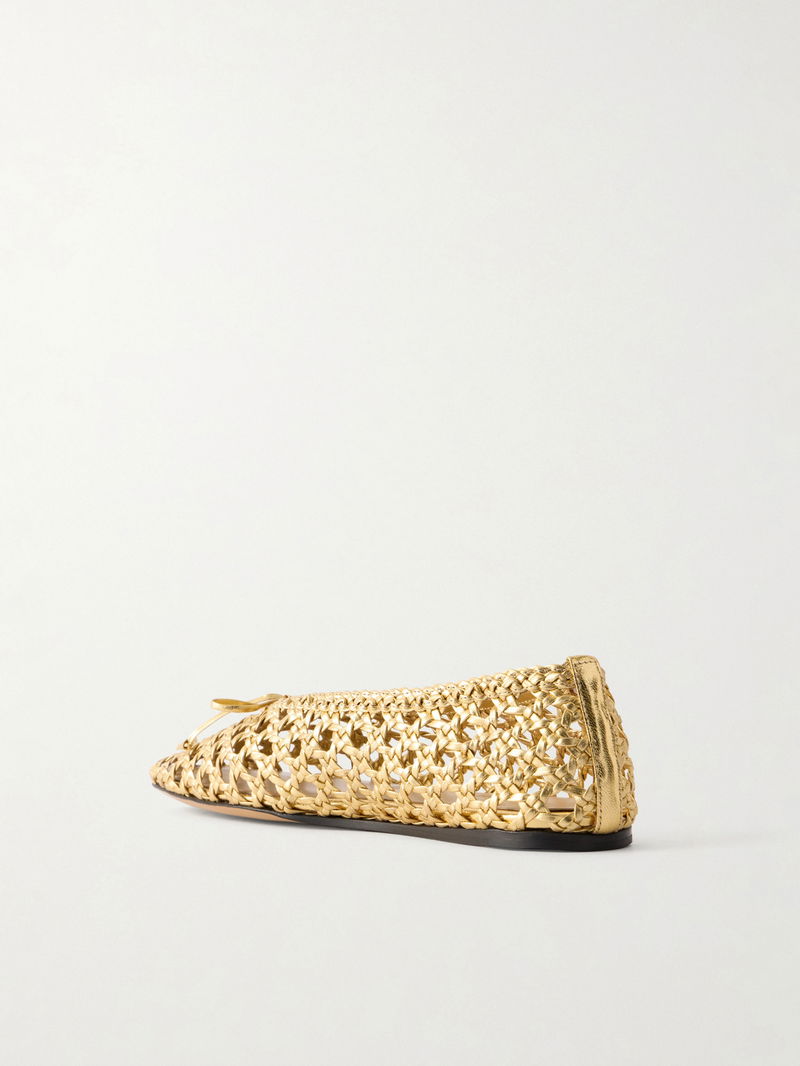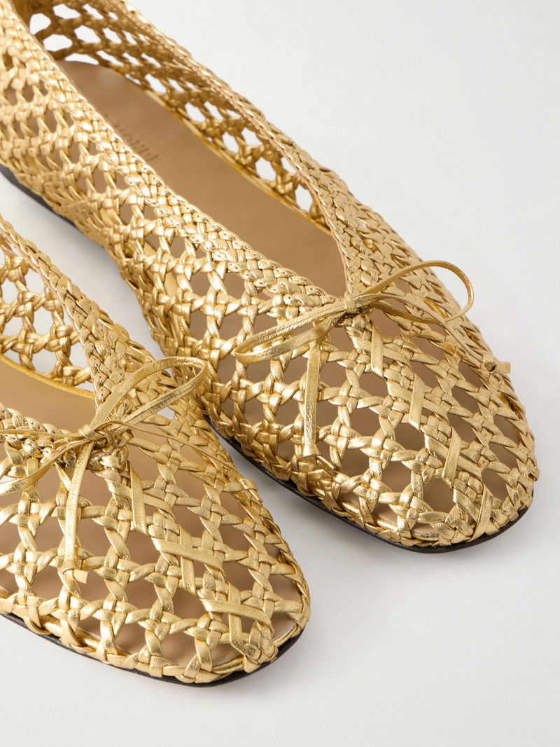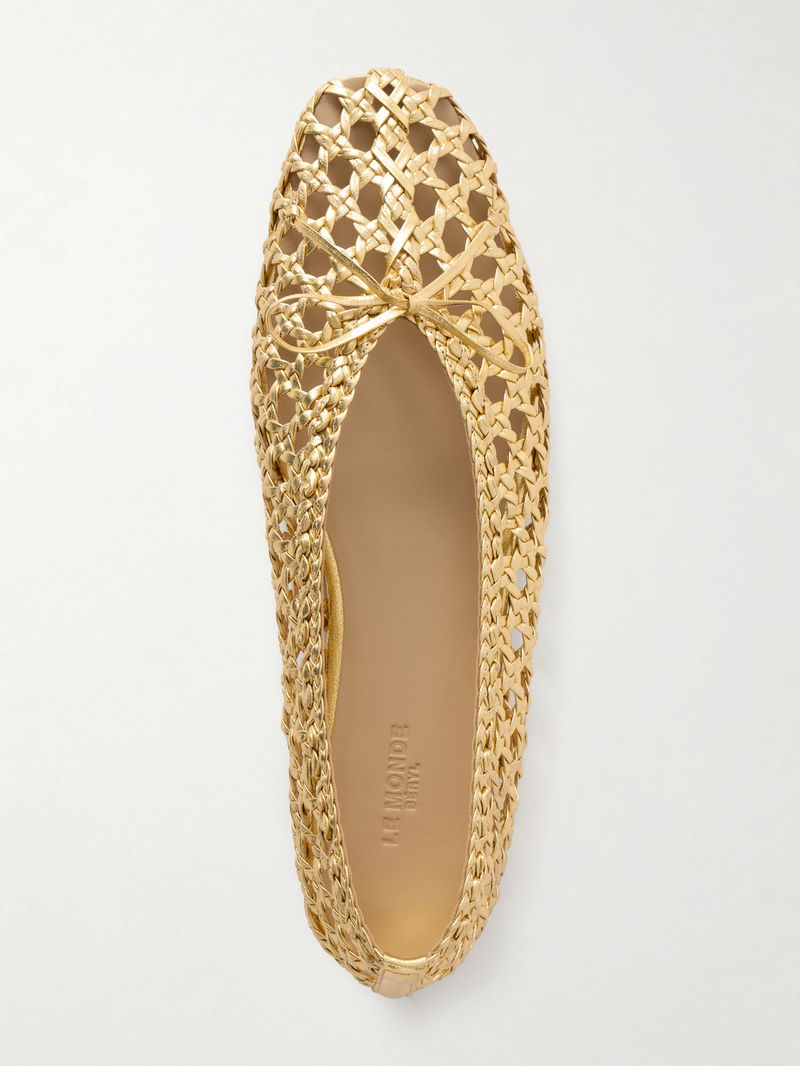 Le Monde Beryl’s 'Regency' ballet flats are woven from gold-tone metallic leather and finished with an endearing bow at the toe. Style them with a monochrome dress to let the shoes stand out.