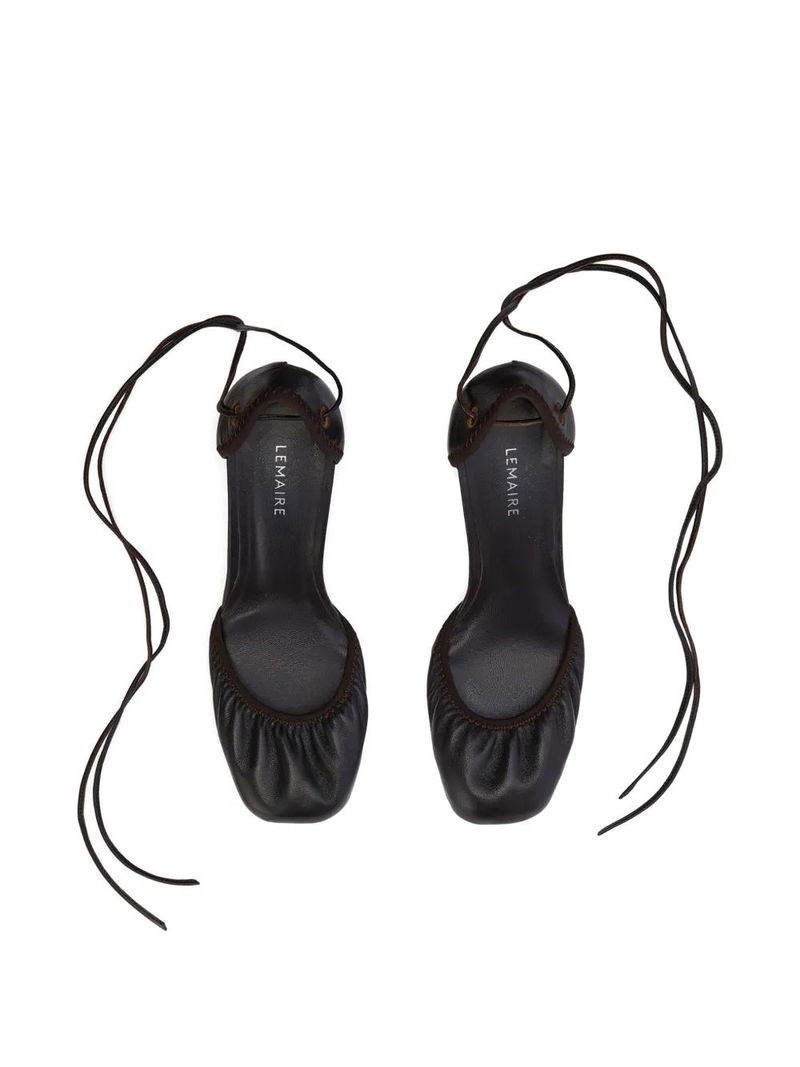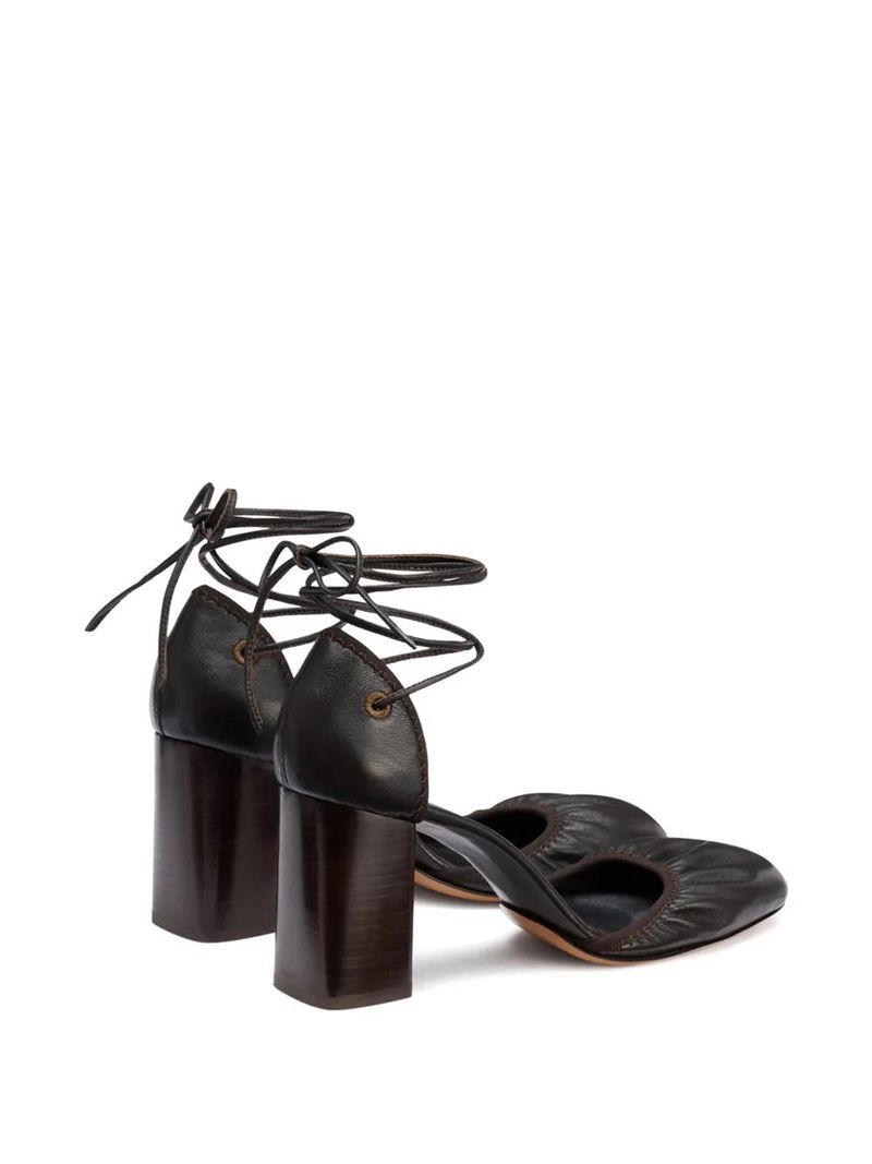 Black tie-fastening ankle strap branded leather insole high block heel gathered detailing.