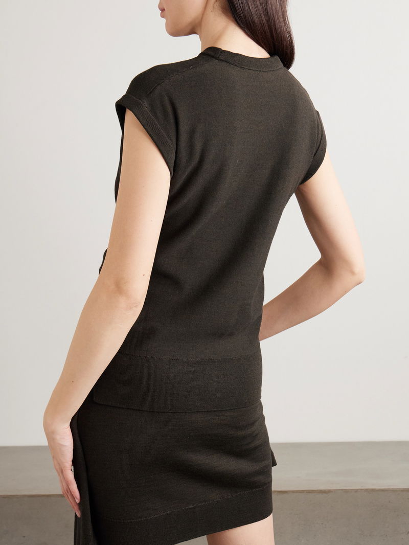 LEMAIRE's top features draped side panels that you can button up to adjust the shape. Made from soft wool-blend, it's traced with ribbed trims and has a crew neckline framed by cap sleeves. We like it with tailored pants or the matching skirt.