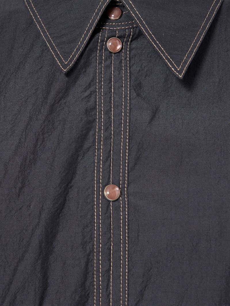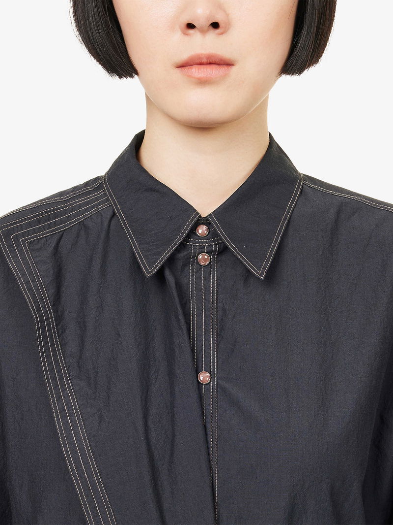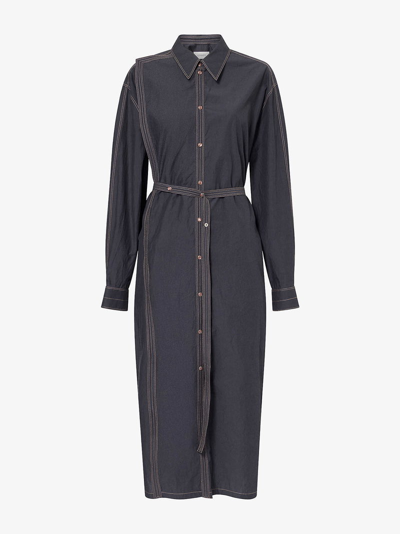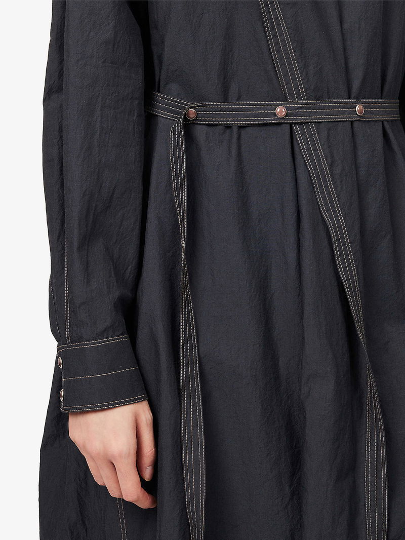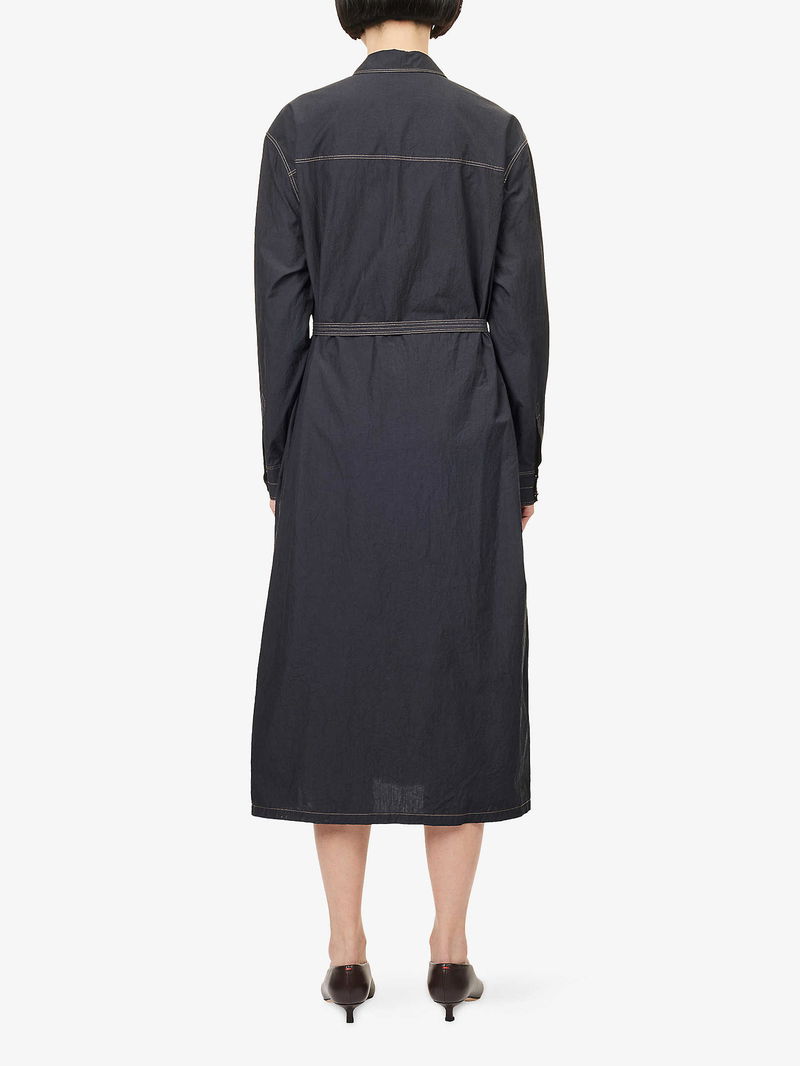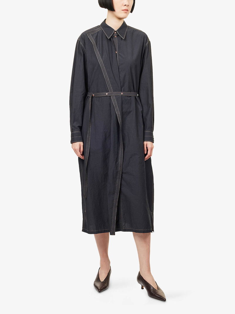 LEMAIRE cotton-poplin midi dress. Concealed popper fastening at front. Relaxed fit, H-line silhouette, spread collar, long sleeves, buttoned cuffs, two slip pockets and buttons embellishment at front, straight yoke at back, detachable belt, all-over winkled texture, contrast stitching, split at sides.