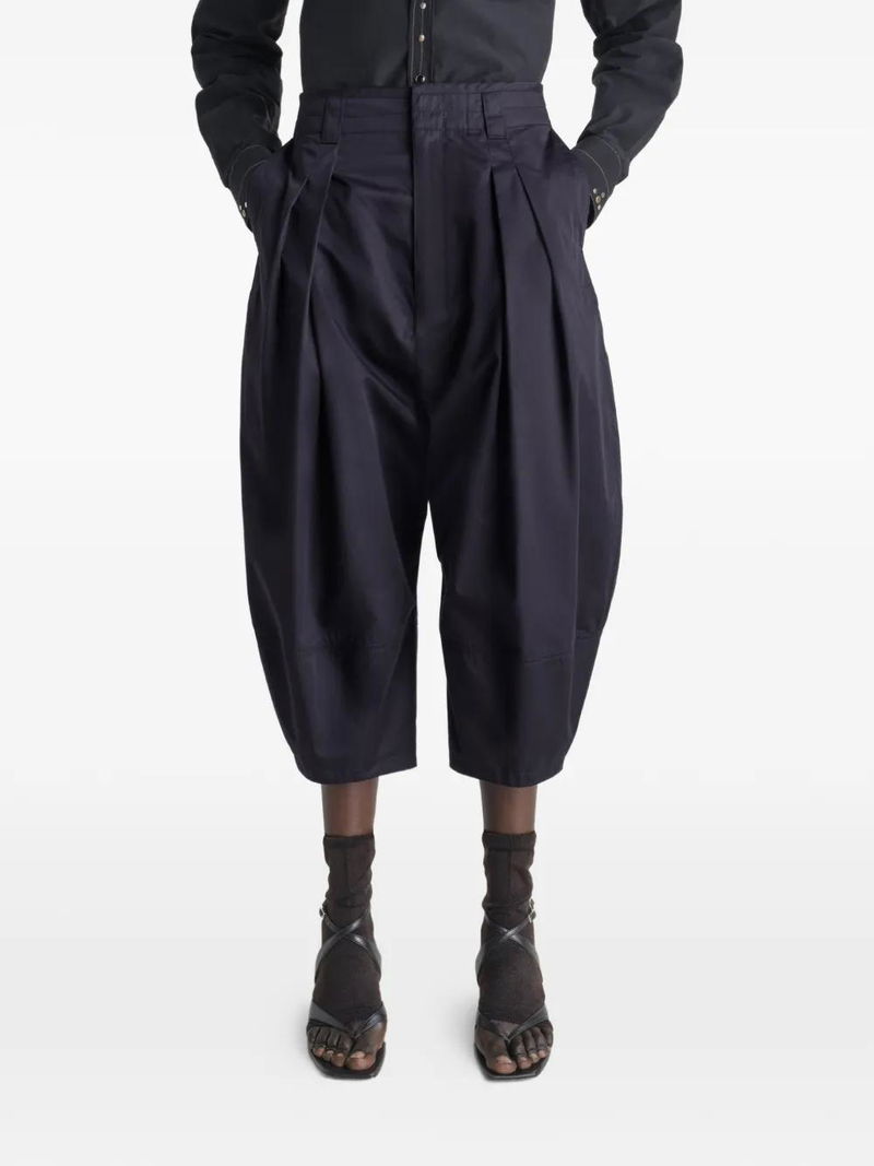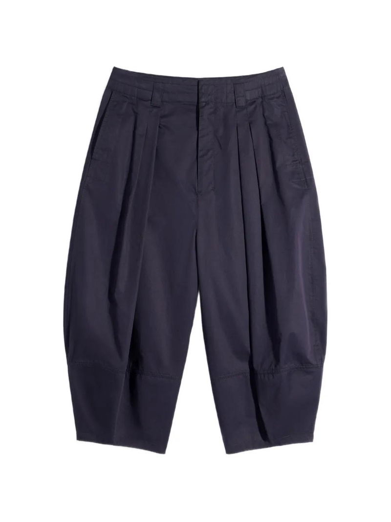 Blue, twill weave, pleated front, knee-length, balloon cut.