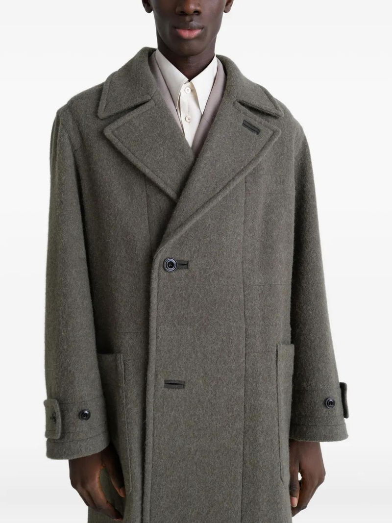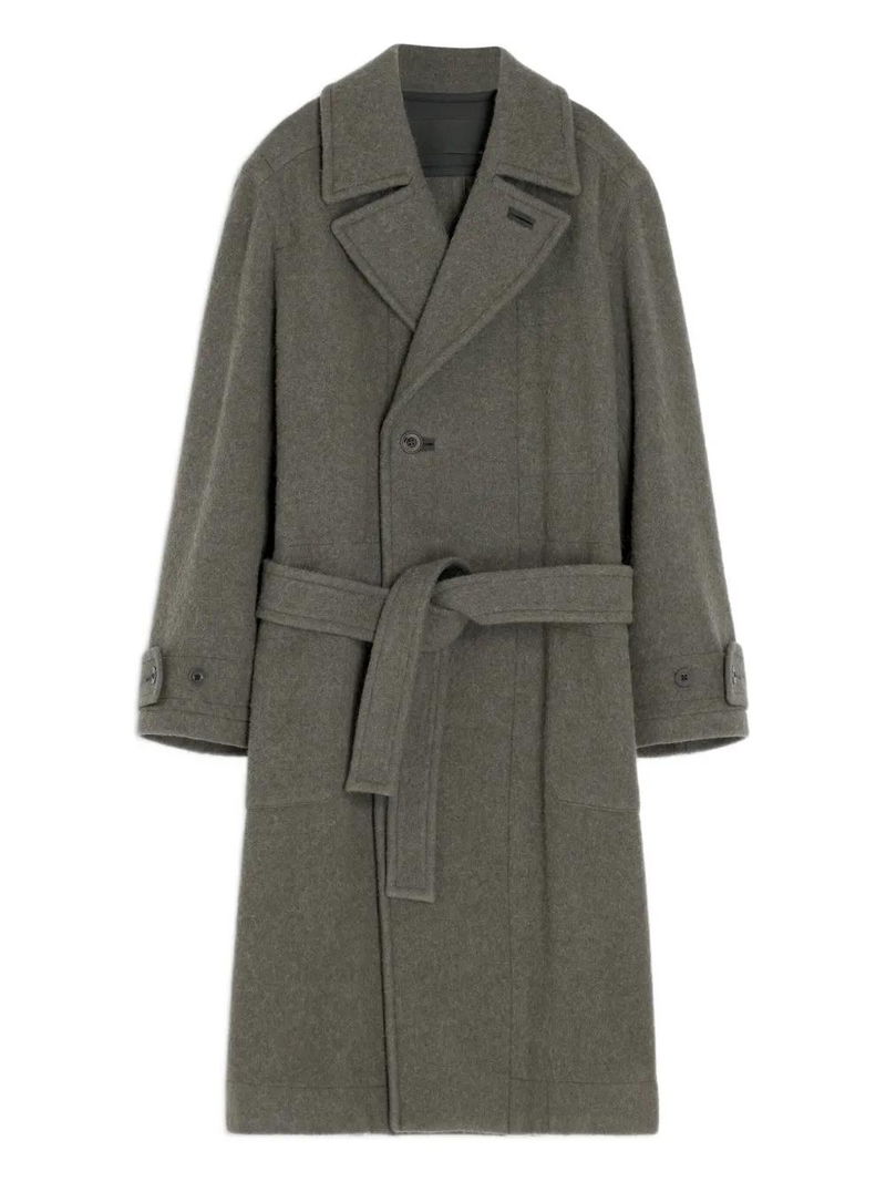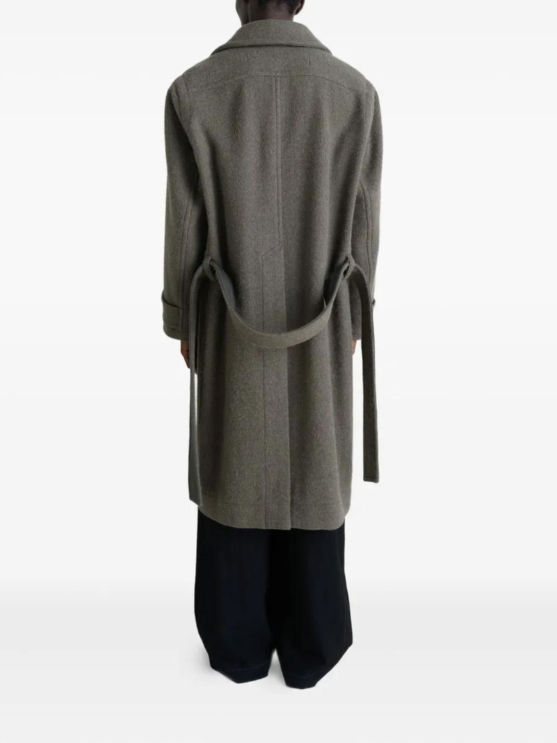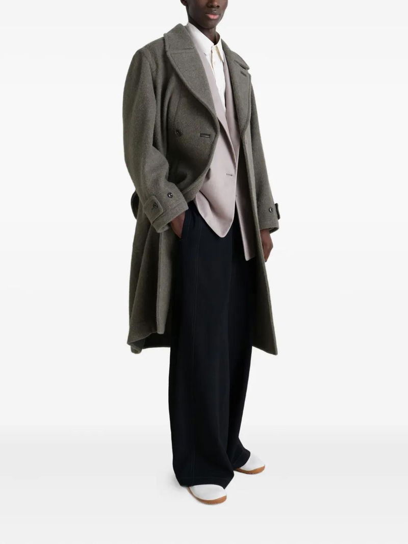 Double breasted button closure side patch pockets back vent belted cuffs notched lapels internal patch pockets oversized cut.