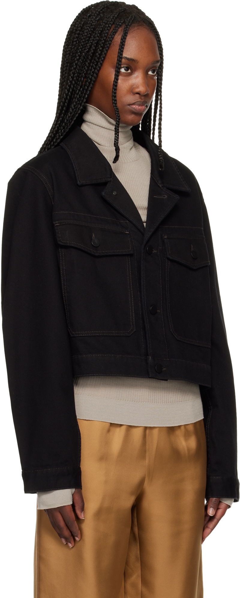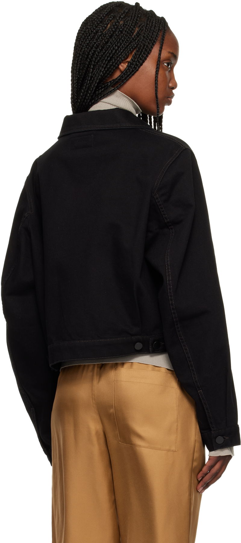 Non-stretch denim jacket. Spread collar. Button closure. Flap pockets at front. Cropped hem. Buttoned barrel cuffs. Adjustable button tabs at back hem.