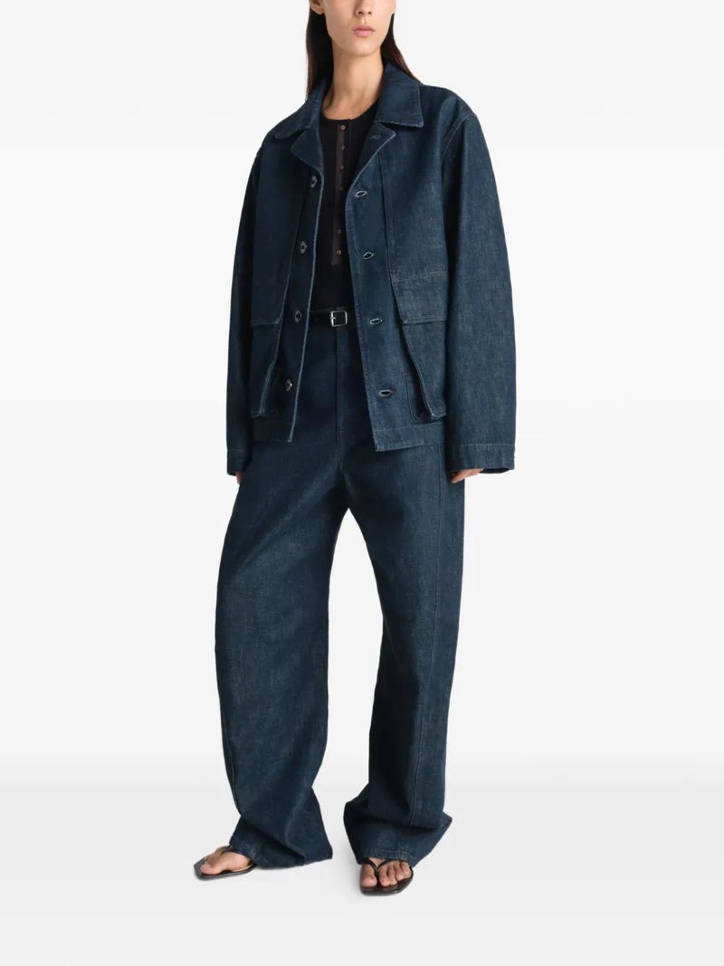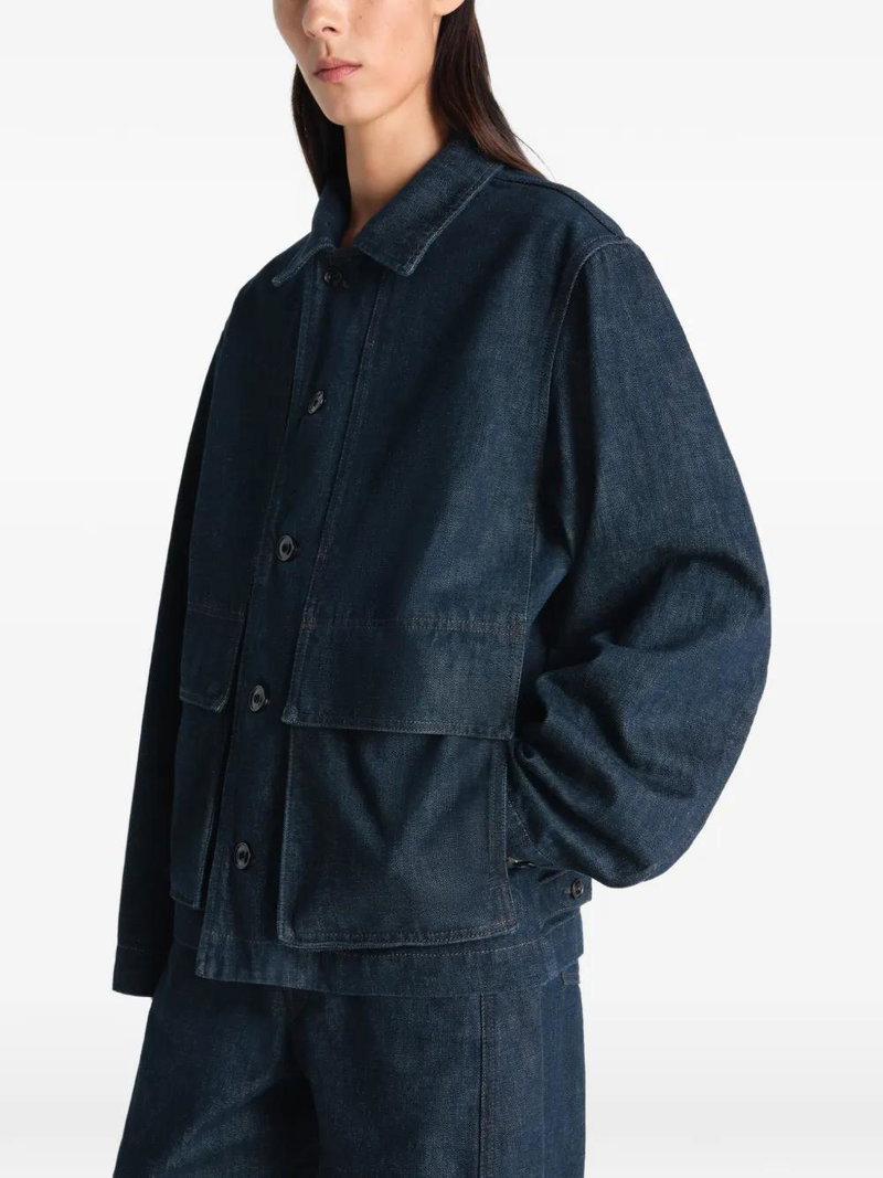Denim blue cotton button closure patch pockets topstitch detail point collar.
