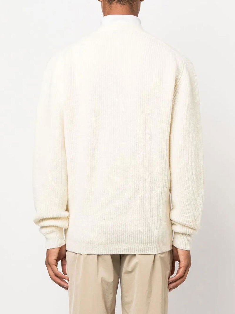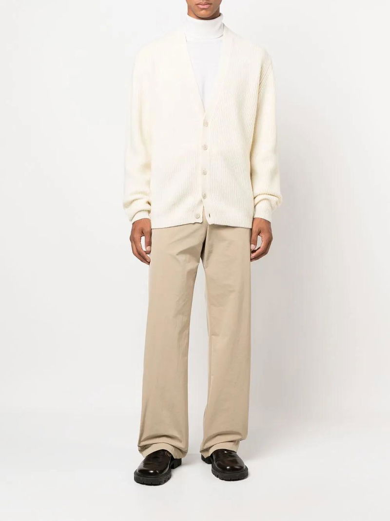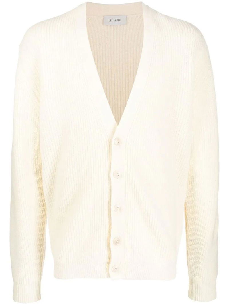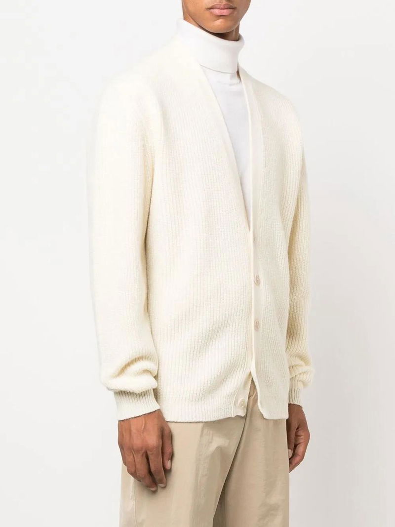 Cream white wool knitted construction V-neck button fastening long sleeves fitted-cuff sleeves.