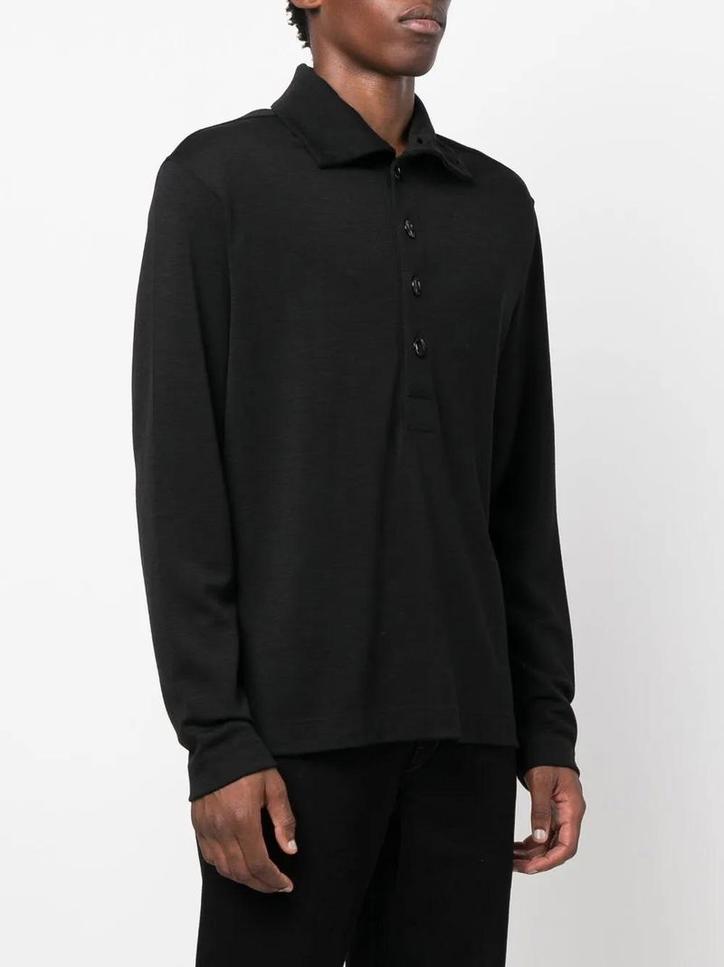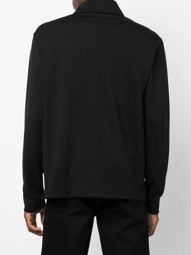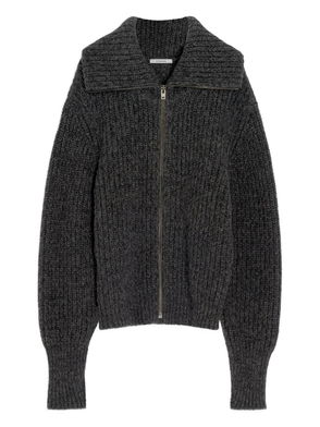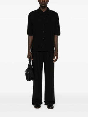Black wool blend knitted construction front button fastening high neck long sleeves straight hem.