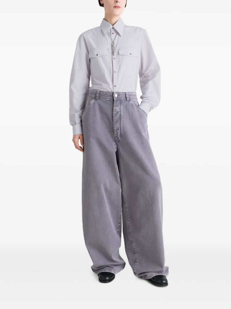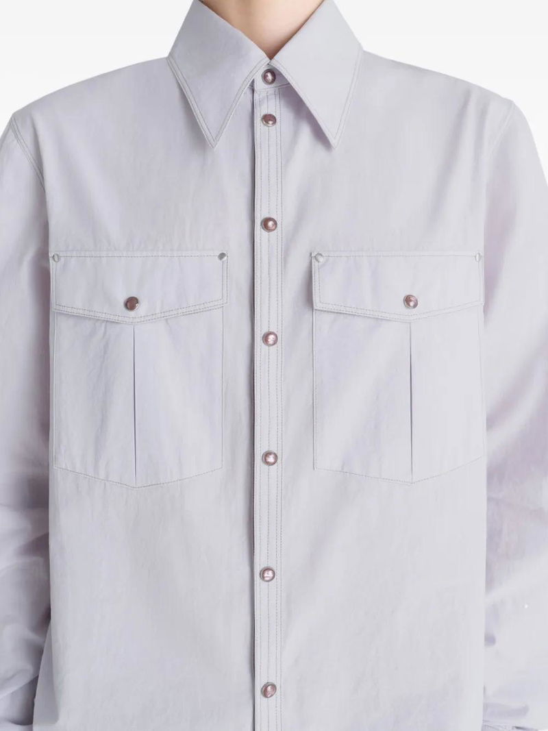 Misty grey, patch pockets, metal ring detail, pearlescent buttons, crinkled look, cotton crepe.