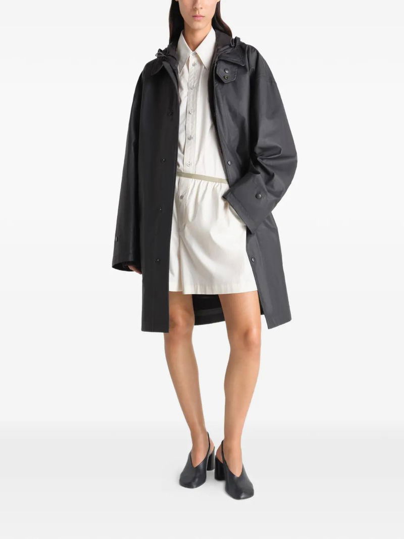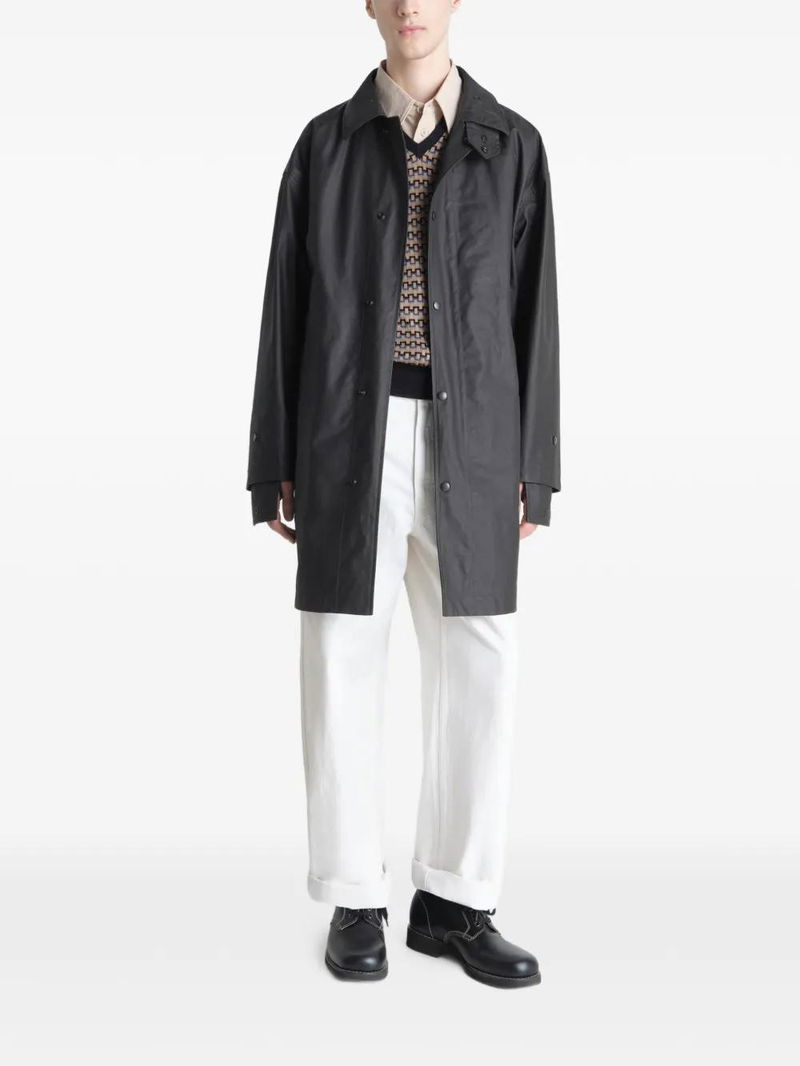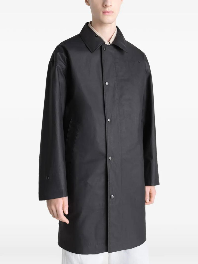 Slate black button fastening pockets structured line utilitarian details water-repellent.