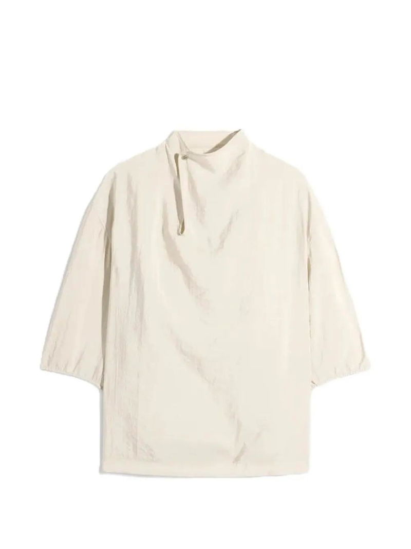 Sand beige, three-quarter sleeves, button detail, mock neck, elasticated hem.