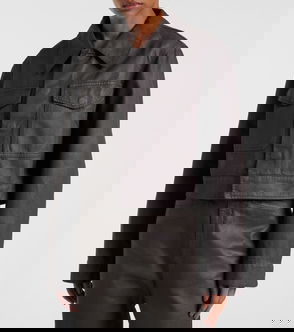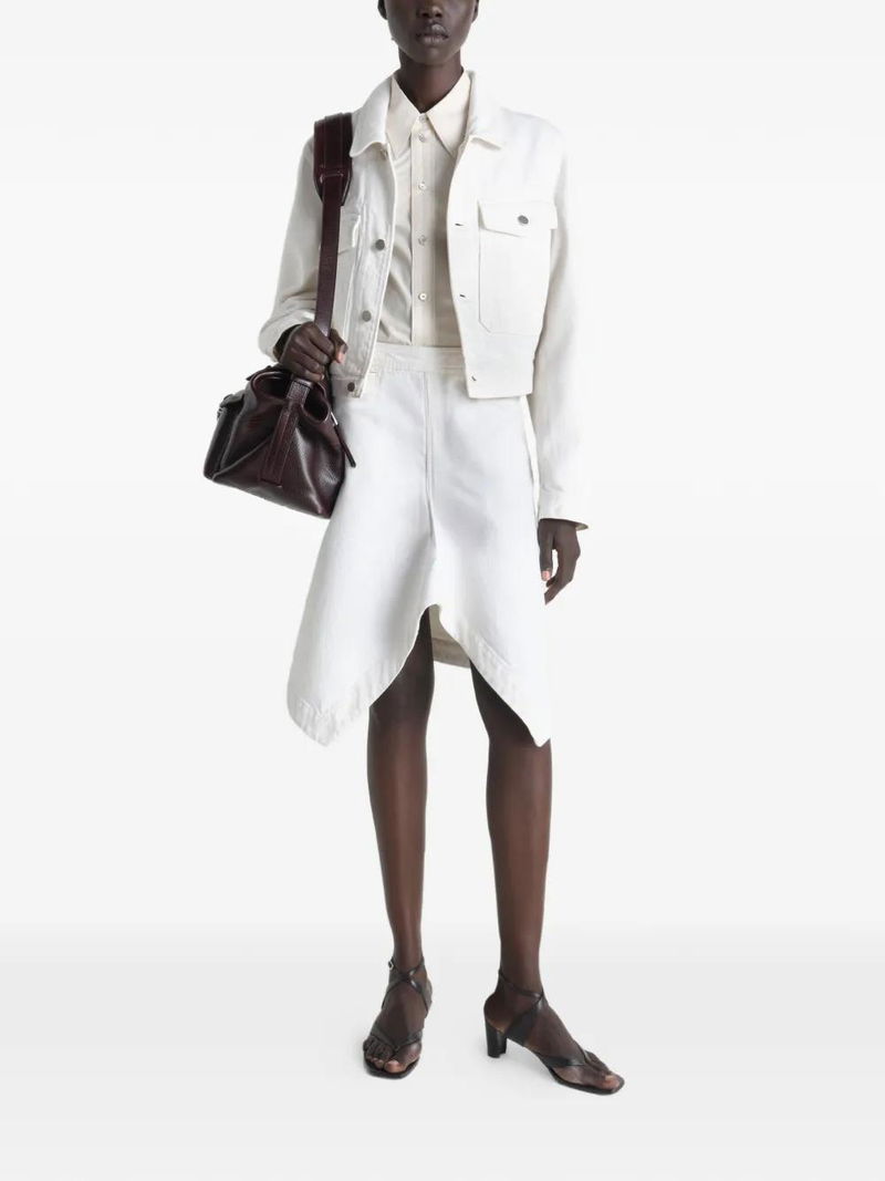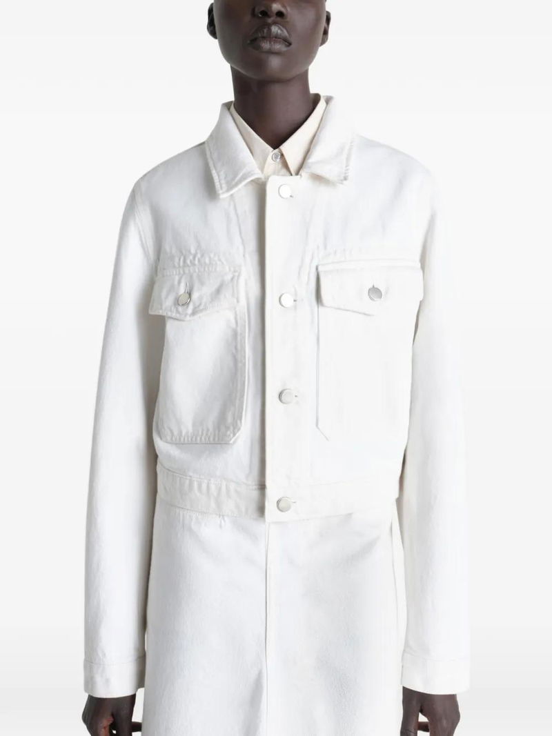 Milk denim, button closure, chest pockets, long sleeves, cropped.