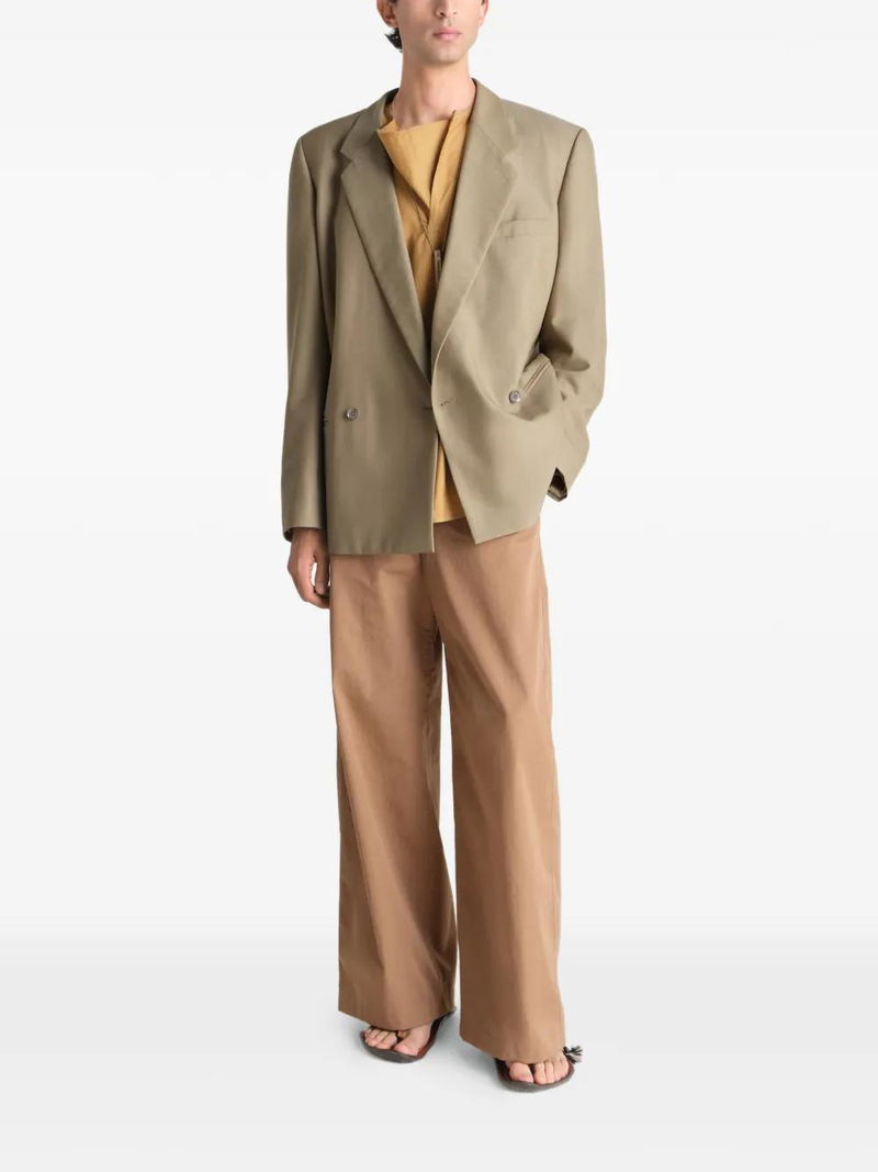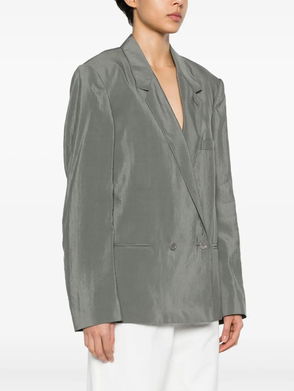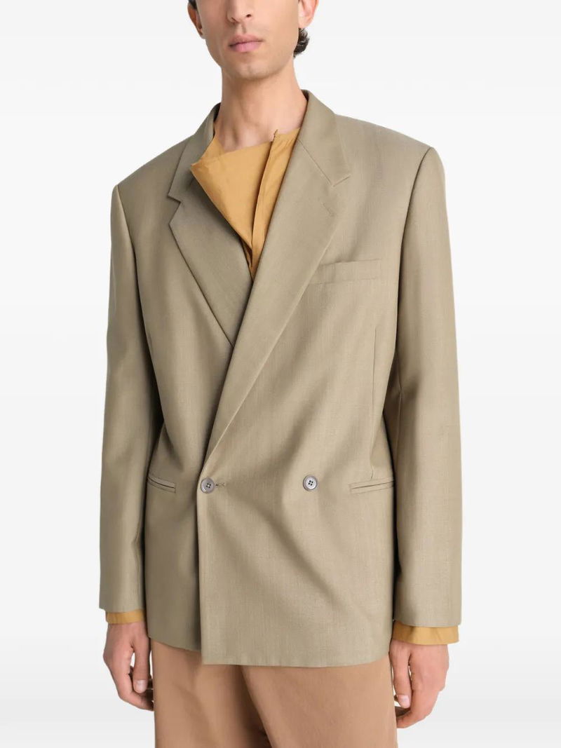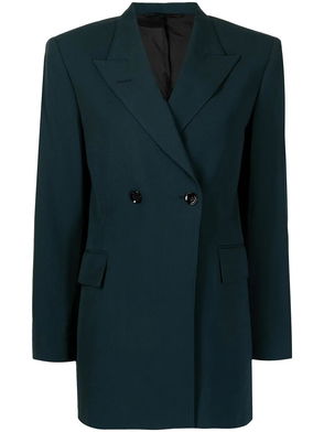 Hay green, double-breasted, small collar, rounded shoulders, flap pockets, two-button fastening.