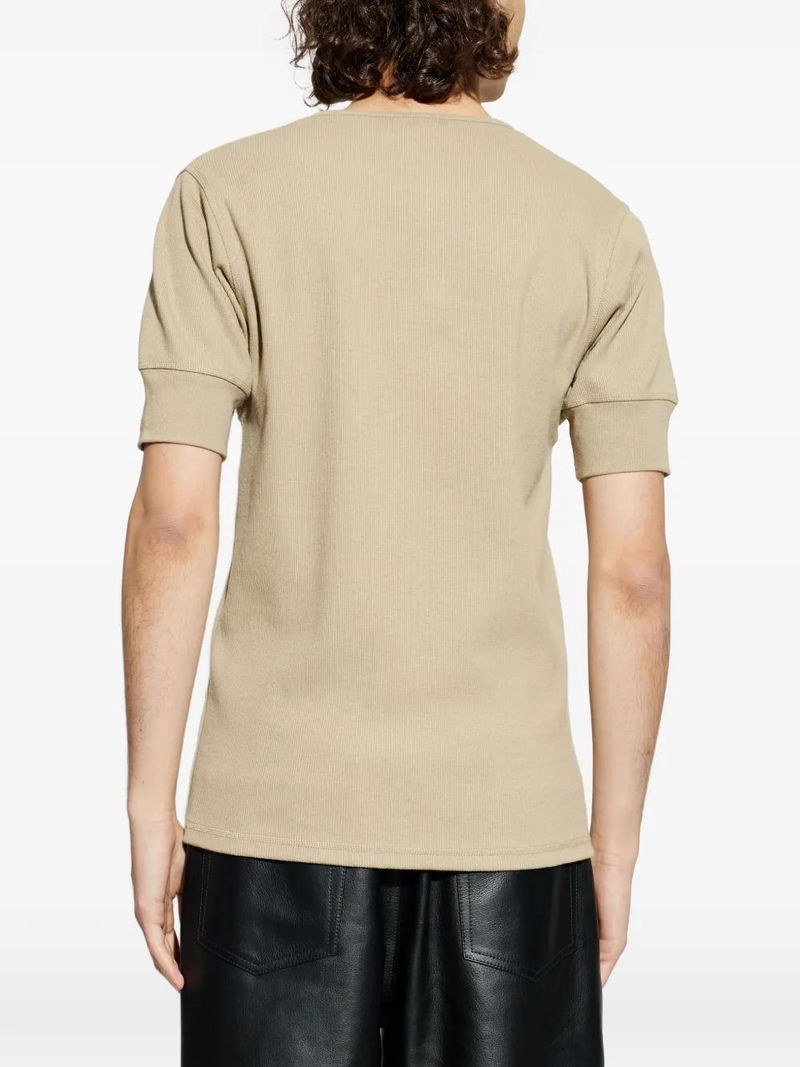 Button fastening, short sleeve, round neck, ribbed texture, cuffed sleeves.