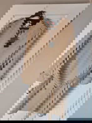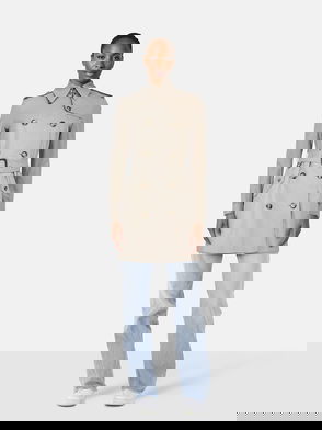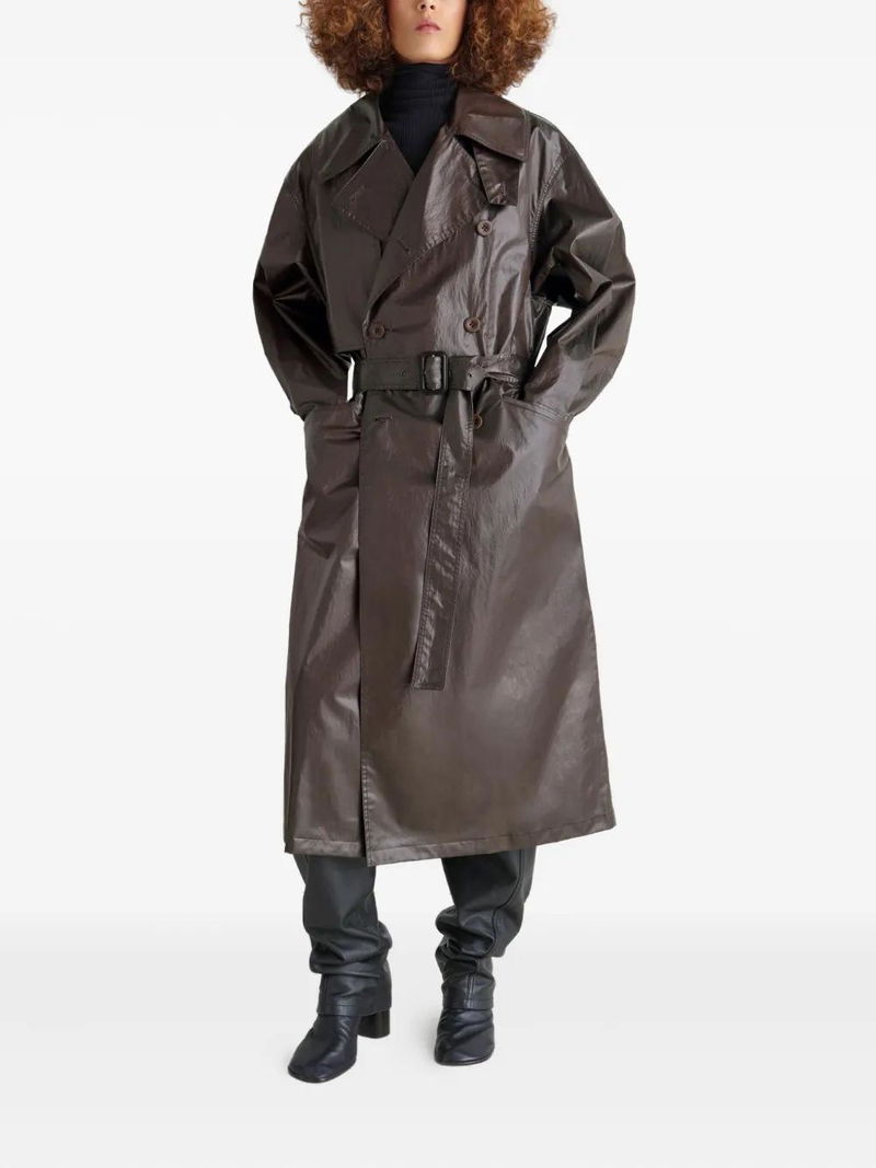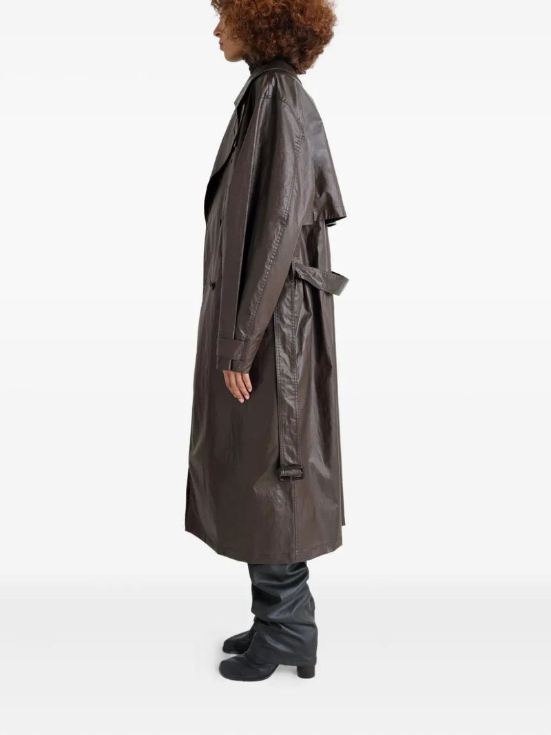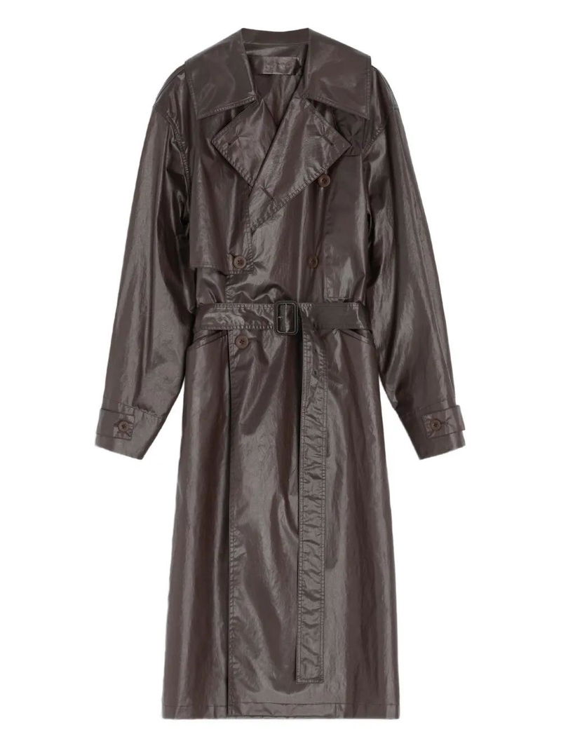 Brown metallic effect, double-breasted, button closure, tailored collar, side pockets, back vent belted.