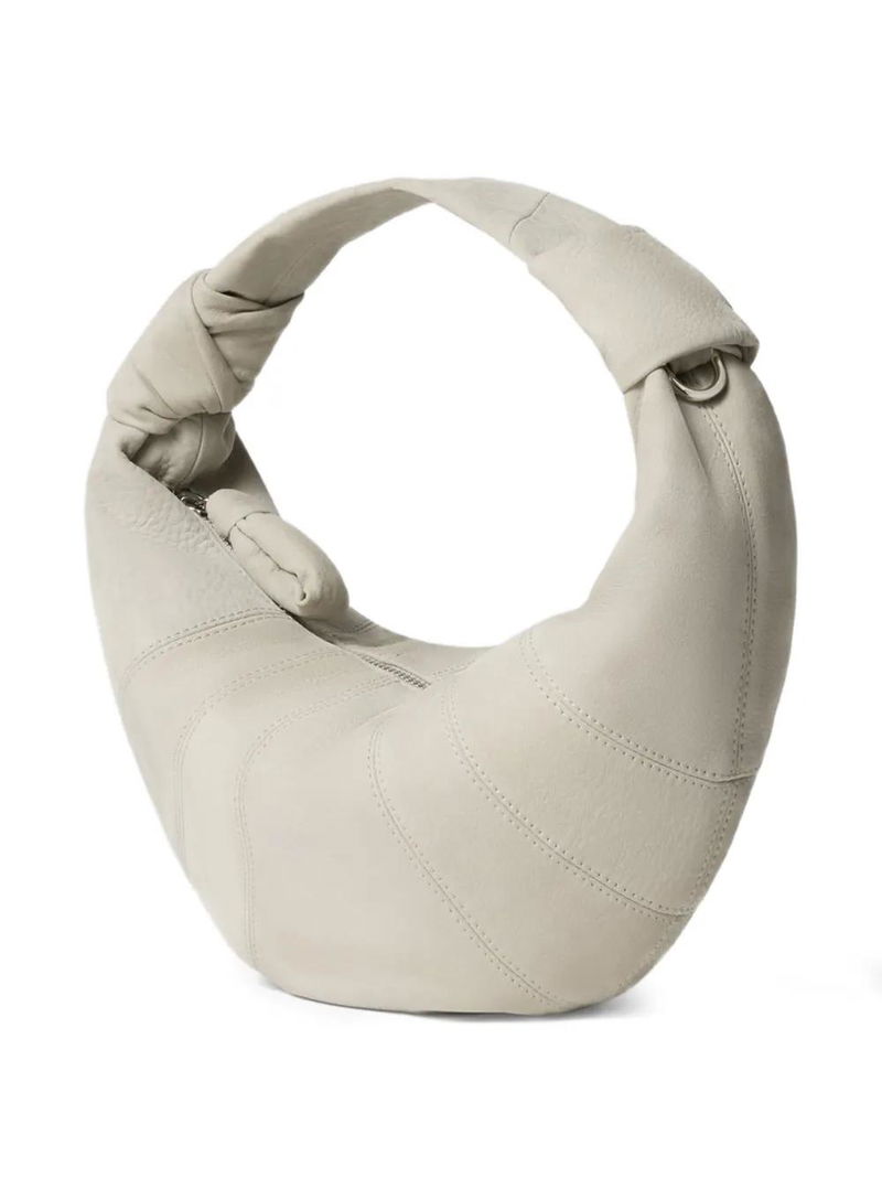 Off white, topstitched, half-moon shape.