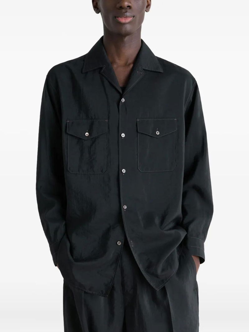 Black notched collar button fastening long sleeves buttoned cuffs flap pockets.