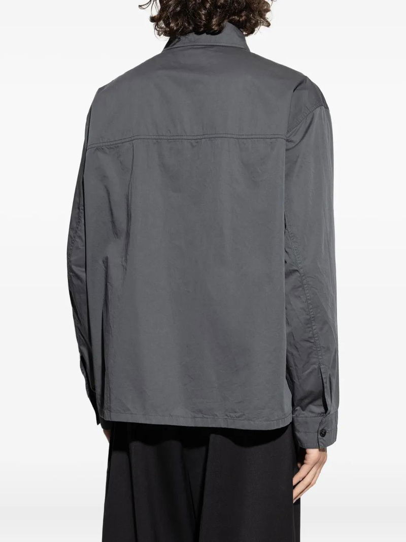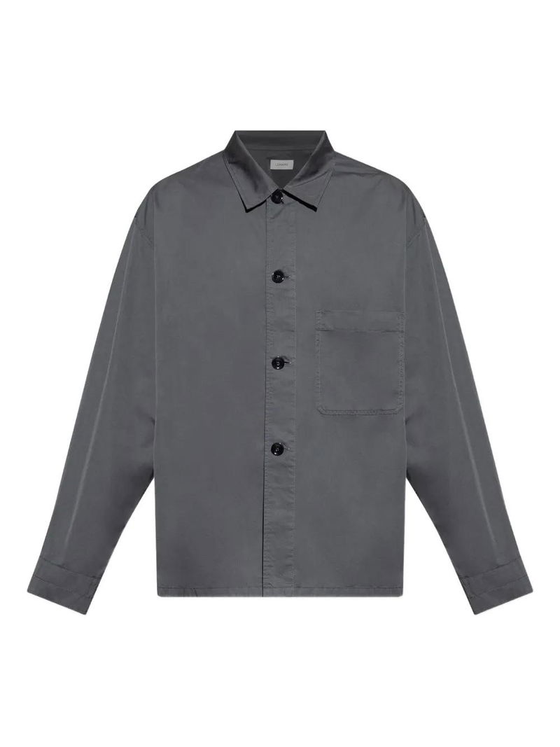 Grey button closure patch pocket long sleeves straight hemline.