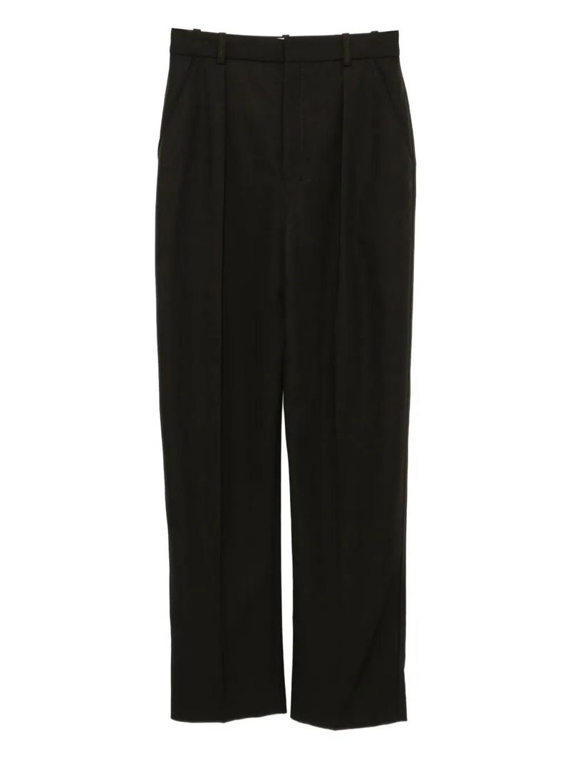 Cedar brown concealed front button, hook and zip fastening two side slash pockets two rear welt pockets.