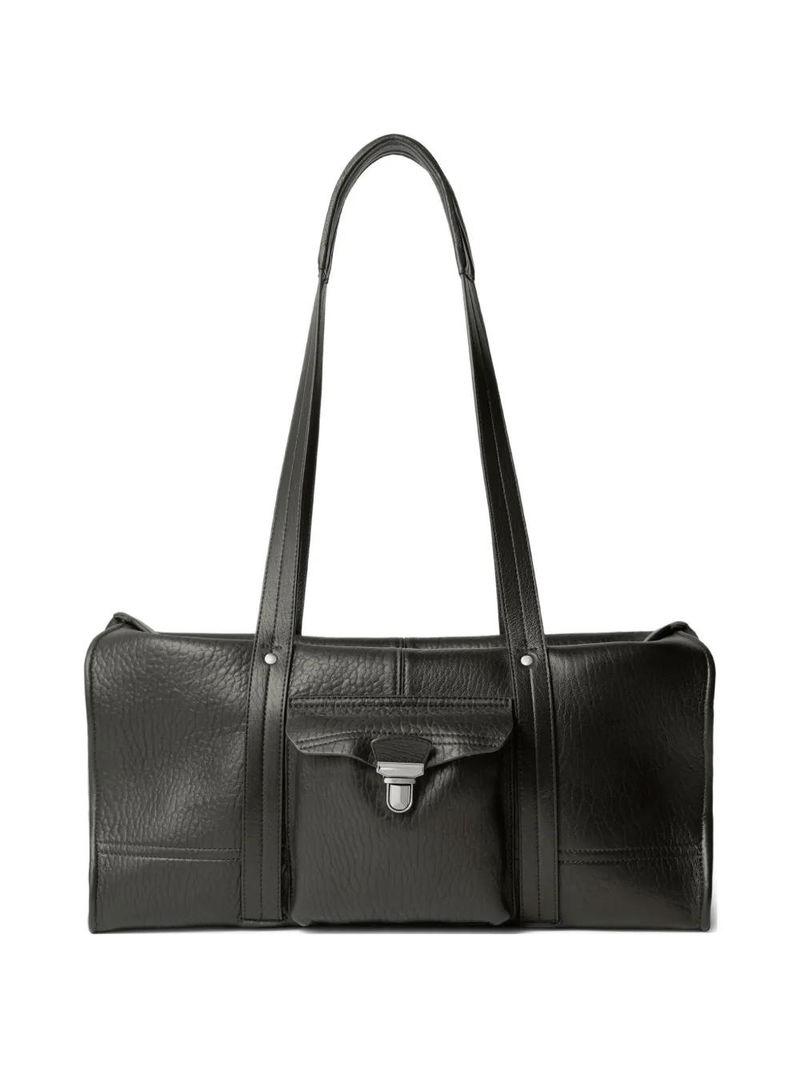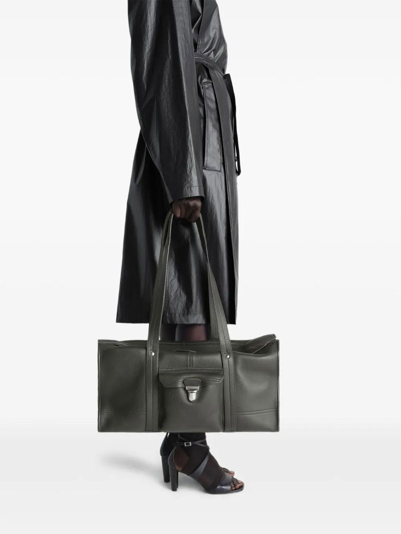 Green, bubble finish, flap pocket, metal clip fastening, wide handles, magnetic closure.