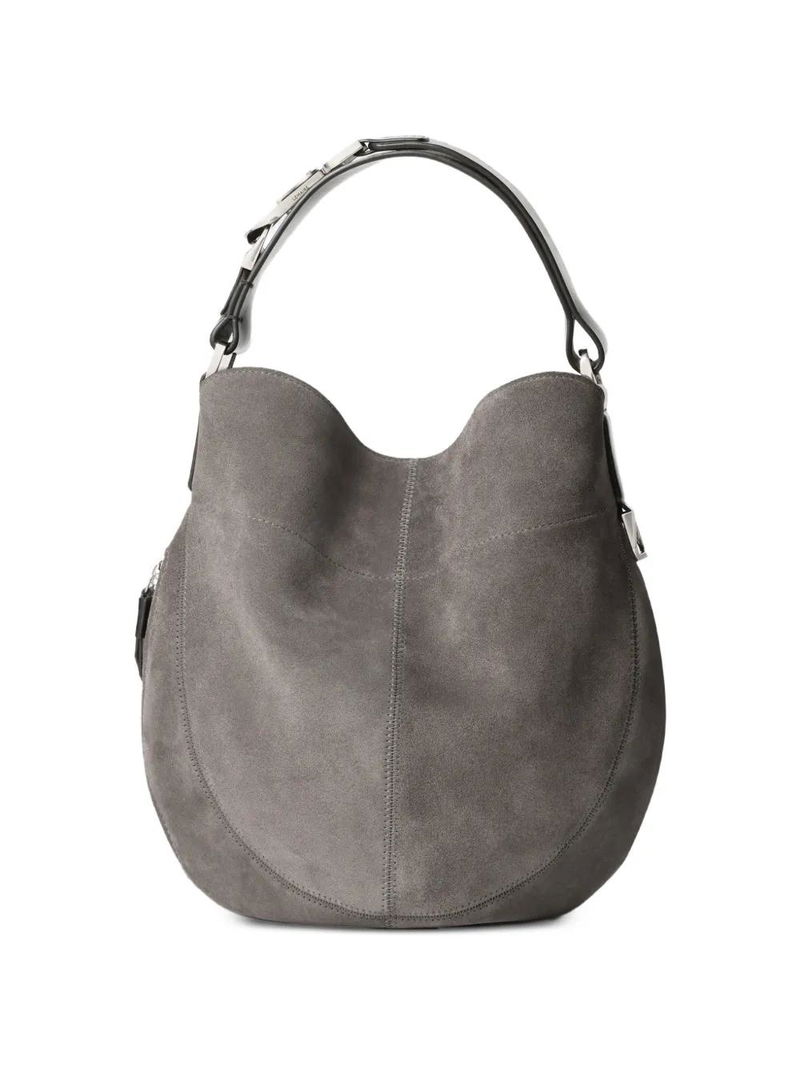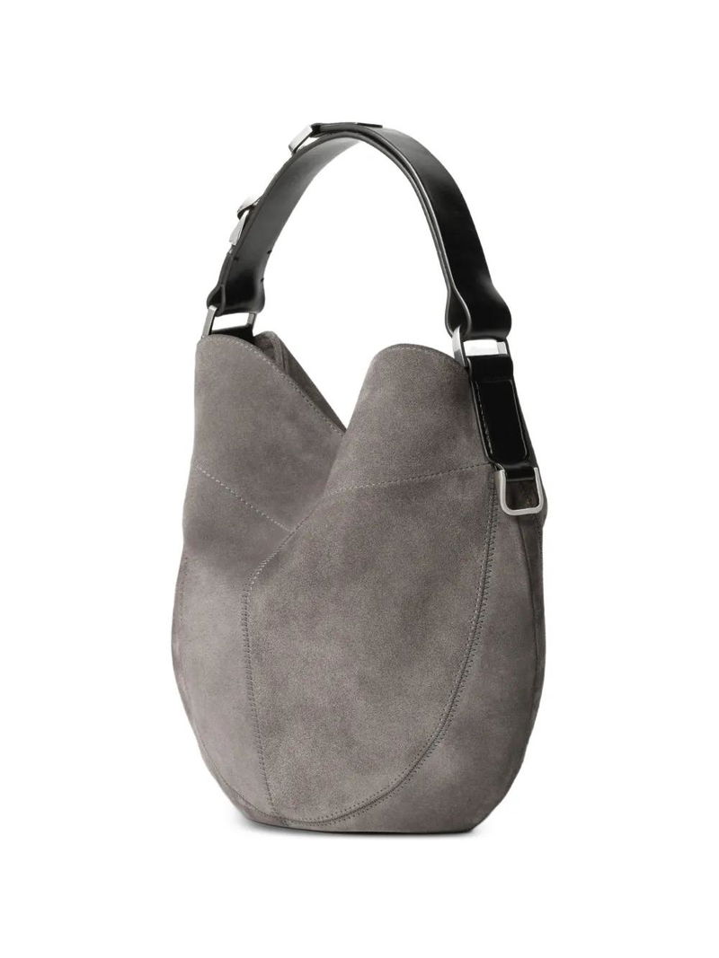 Grey adjustable strap carabiner detail top handle curved panel construction.