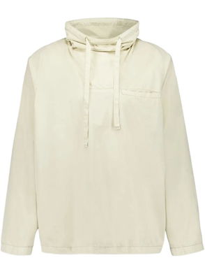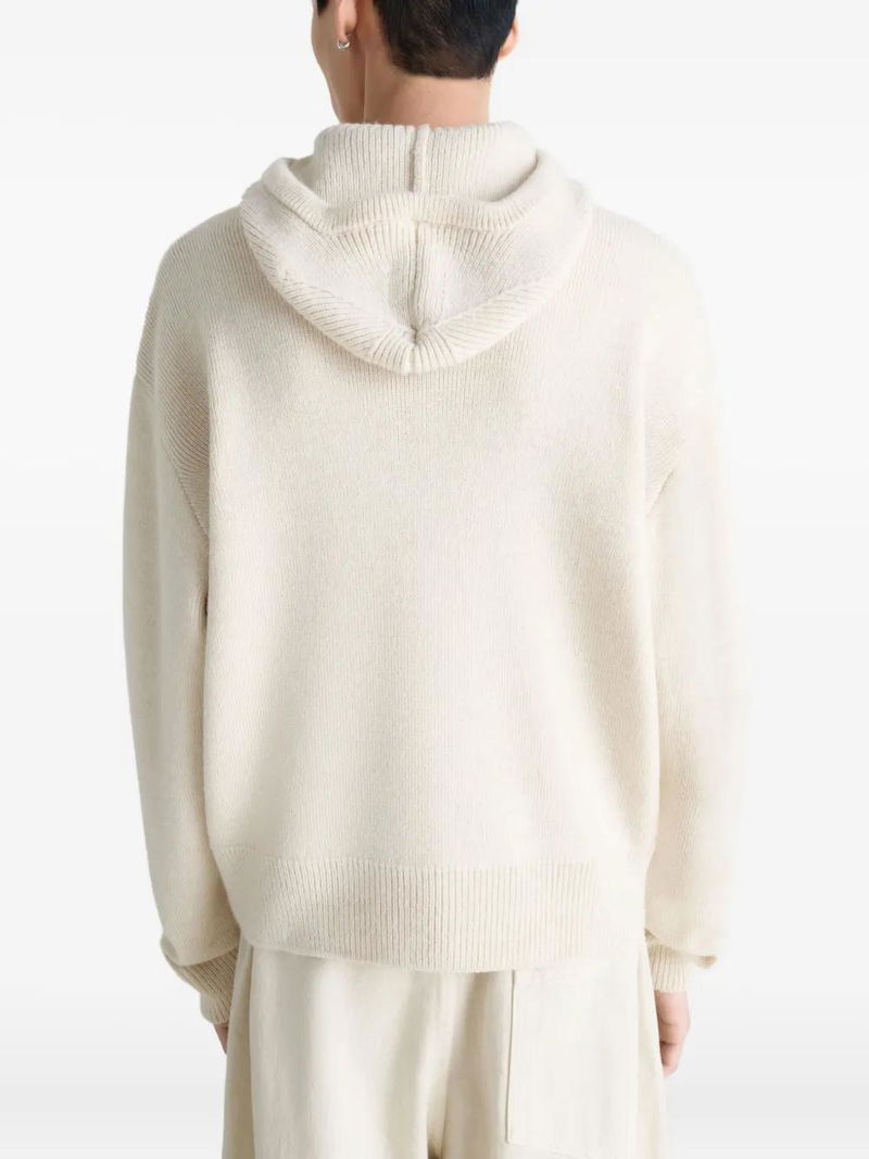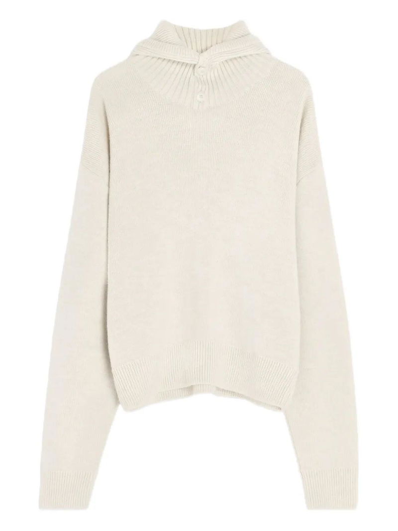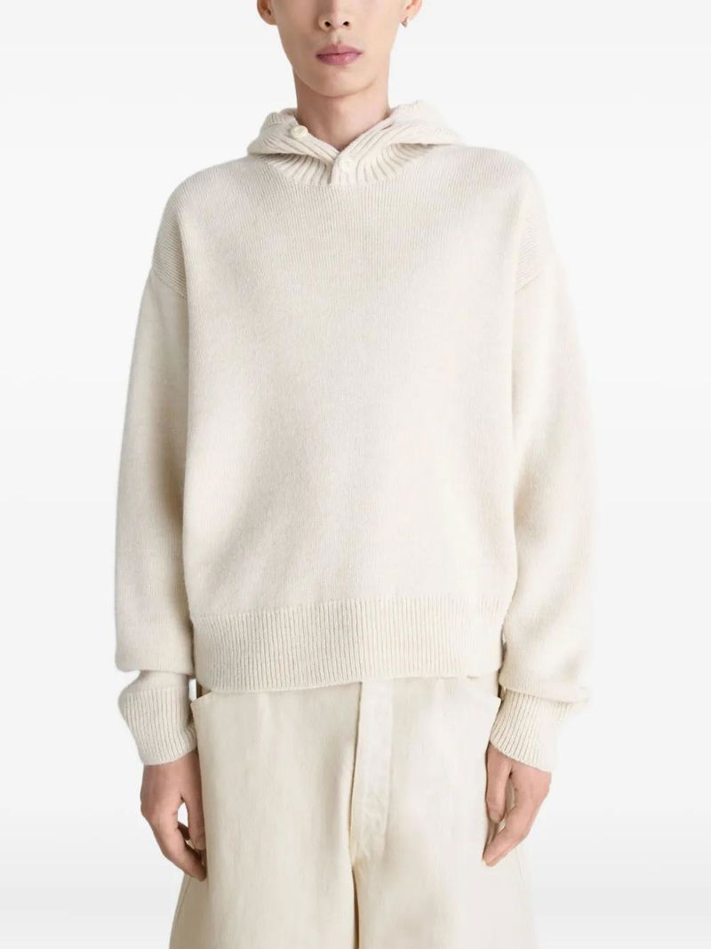 Beige ribbed knit hood button fastening long sleeves ribbed trims straight cut.