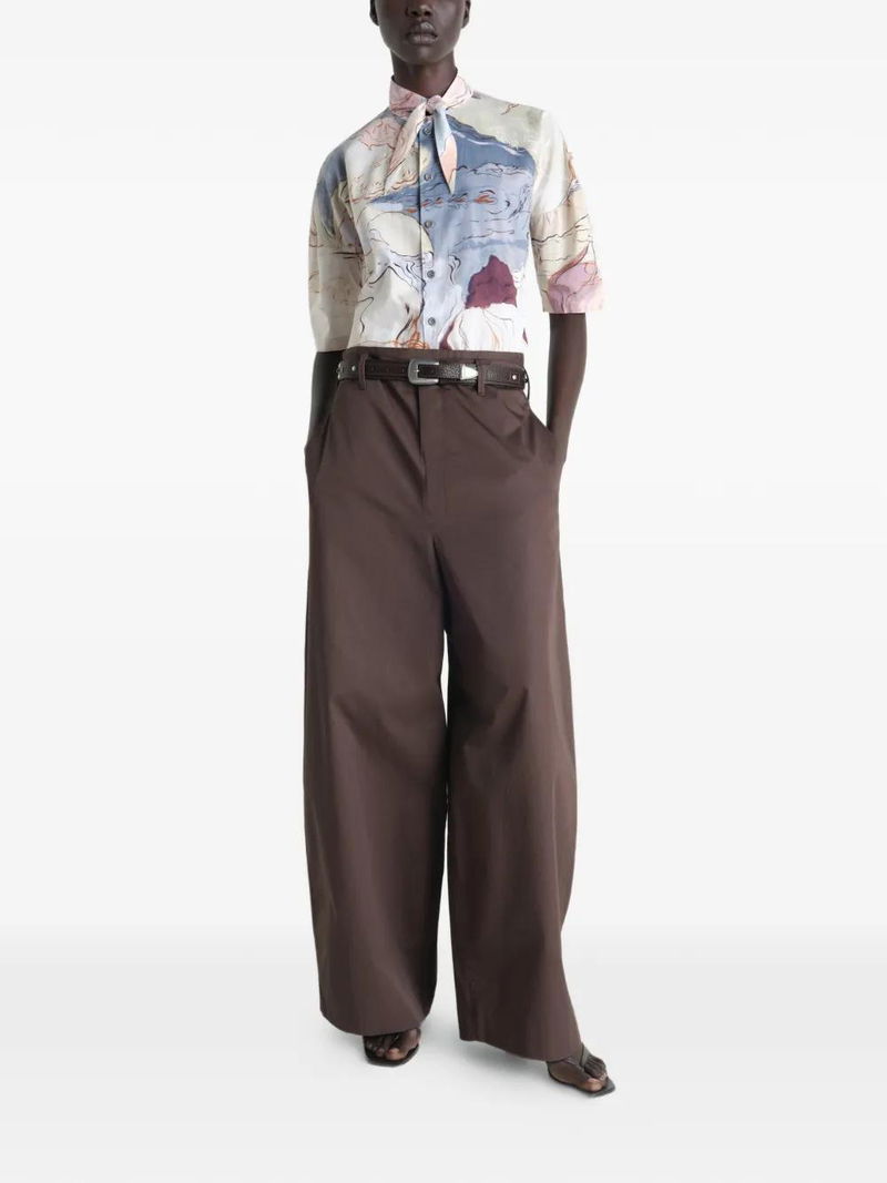 Beige and blue printed design short sleeves scarf button fastening pointed collar.