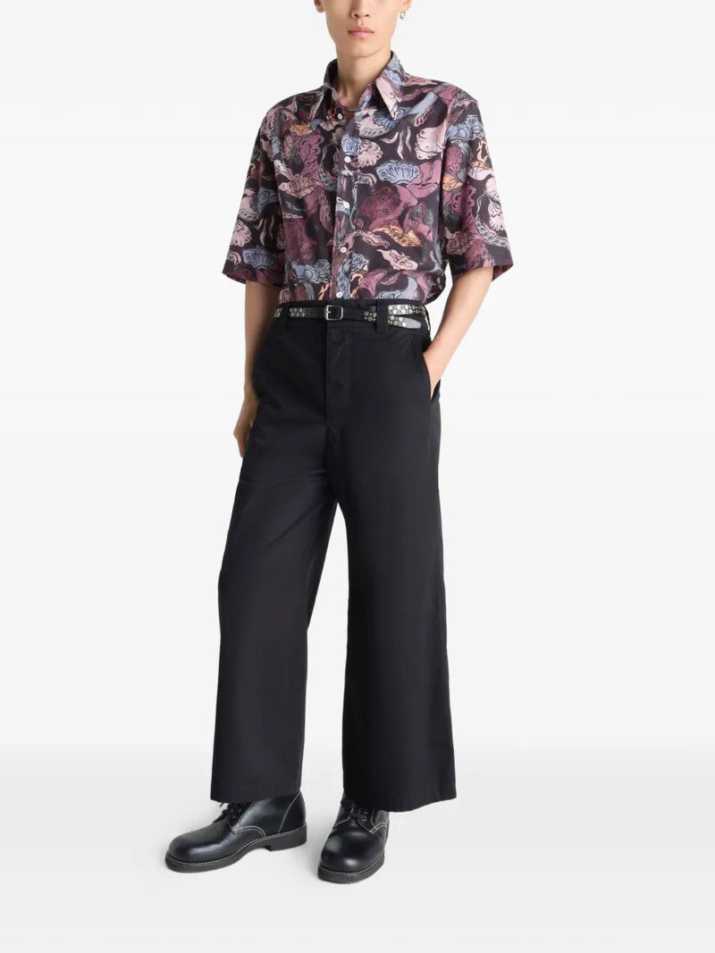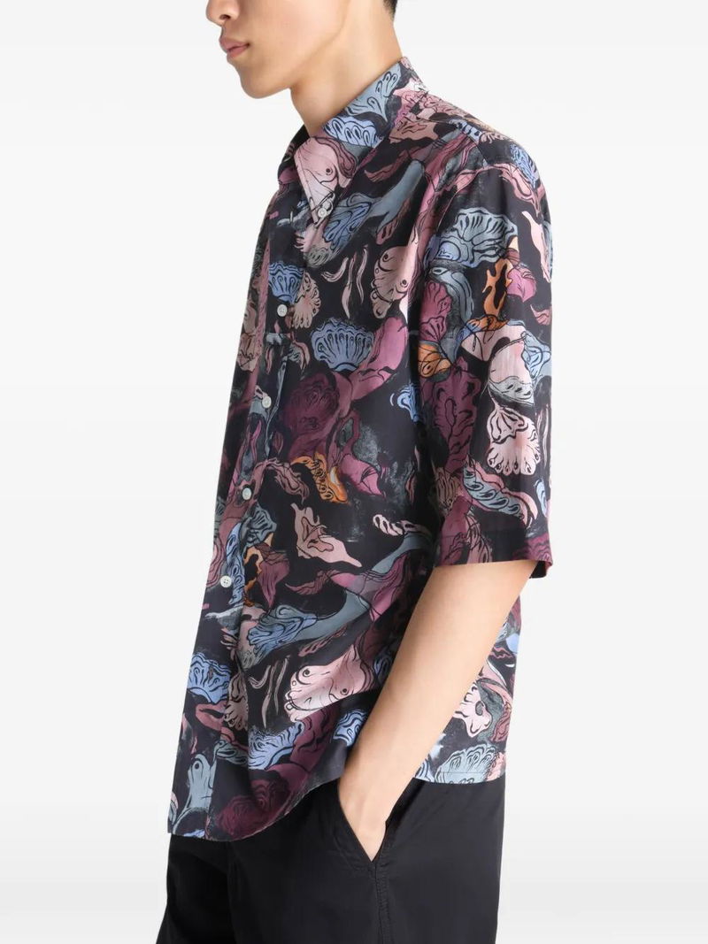 Black and multicolour floral print button-down collar front loop short sleeve button fastening.