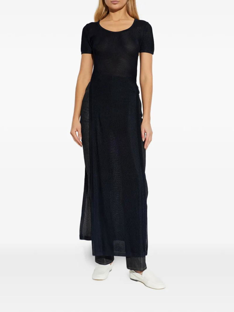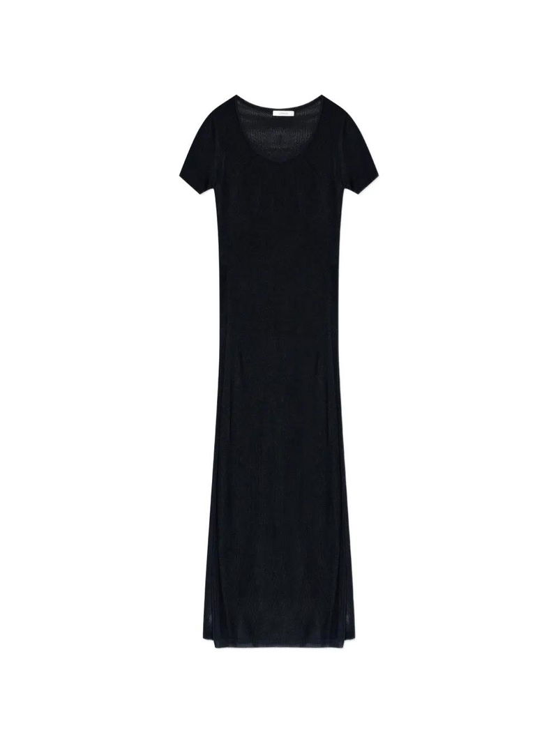 Black crew neck short sleeves side slits ankle-length straight hem.