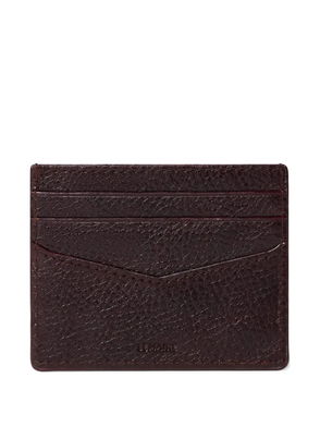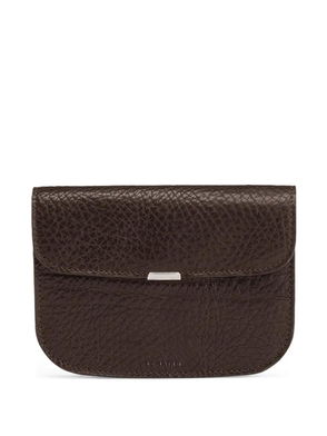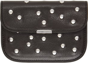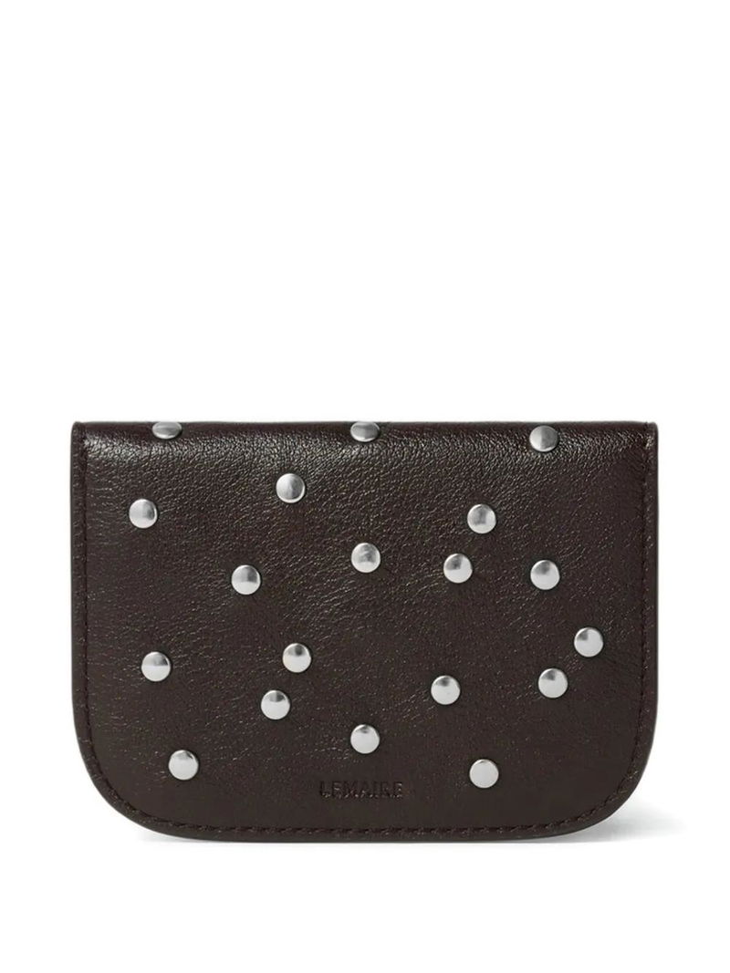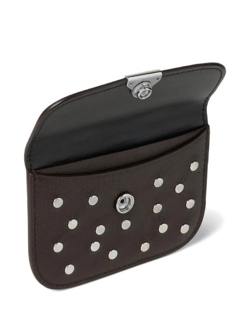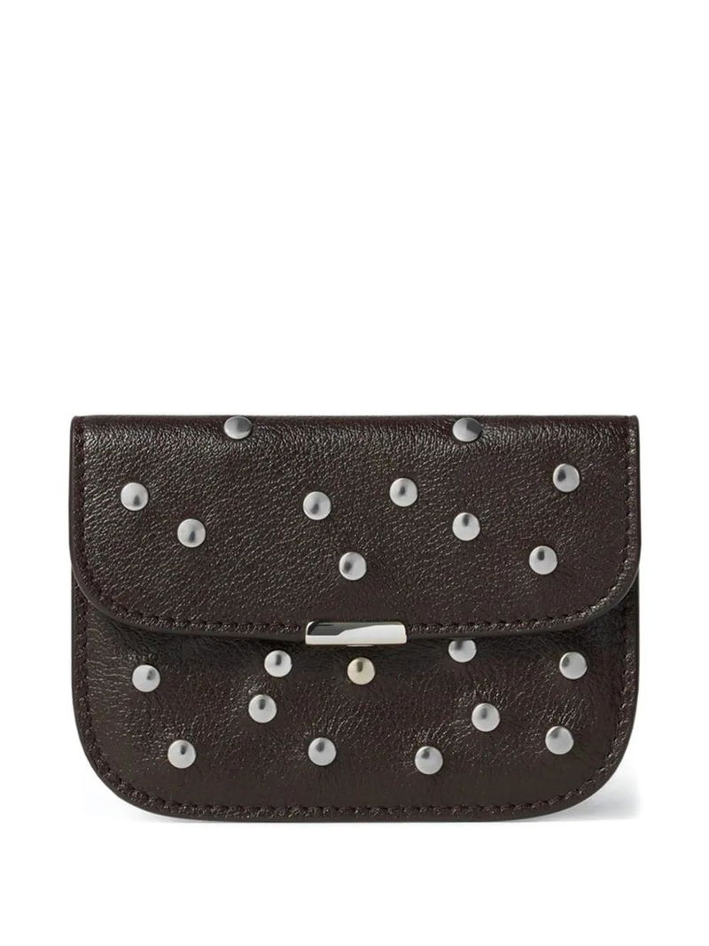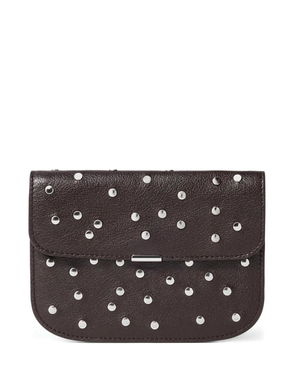 Brown, studded, grain texture, leather, flap closure.