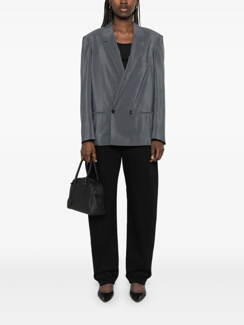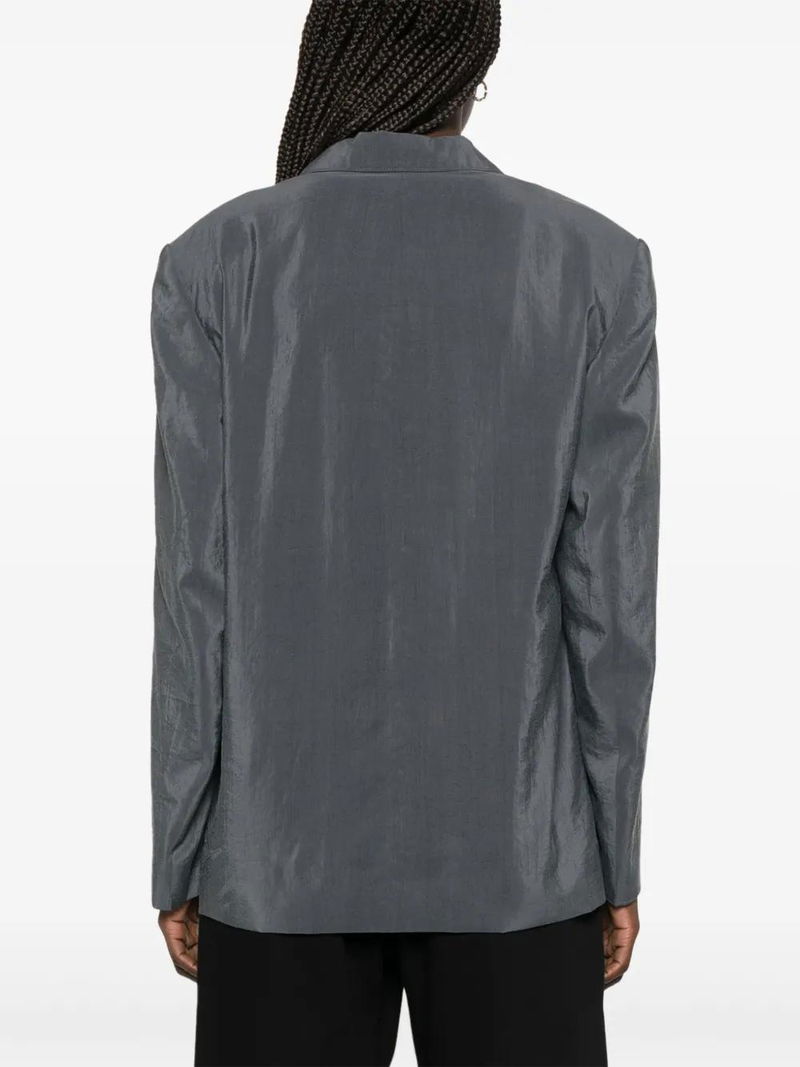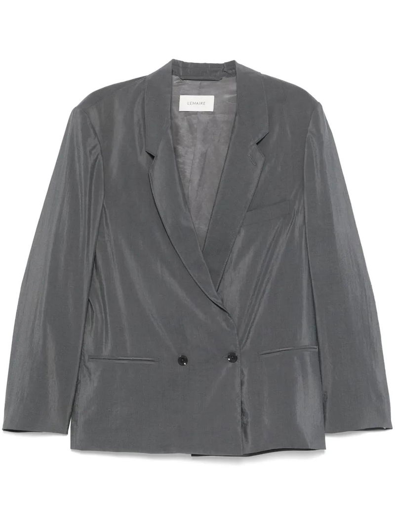 Dark grey double-breasted button fastening jetted chest pocket two front welt pockets notched lapels.