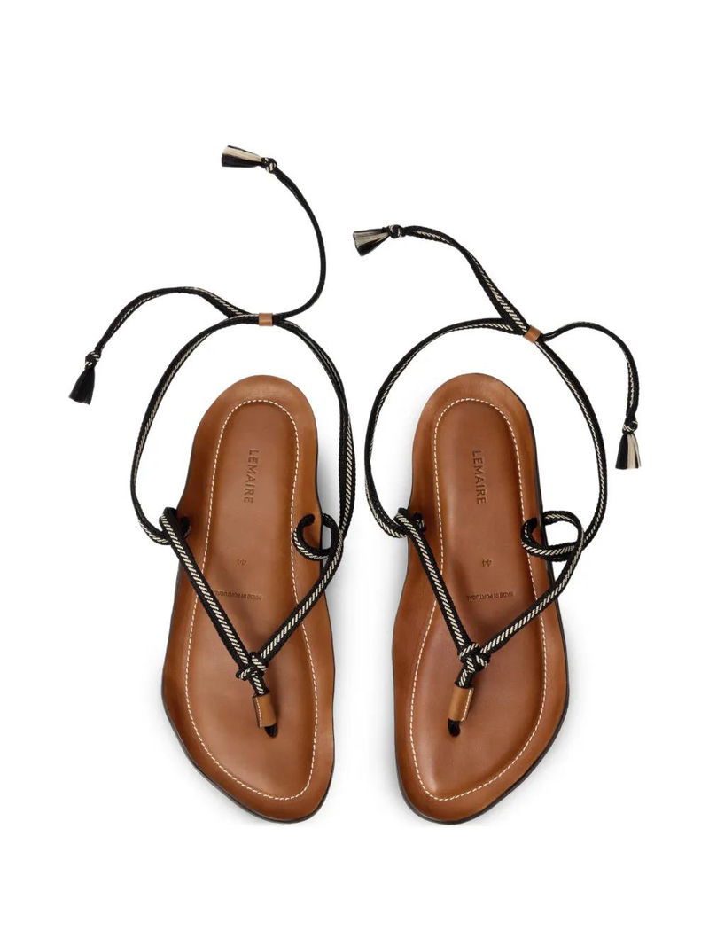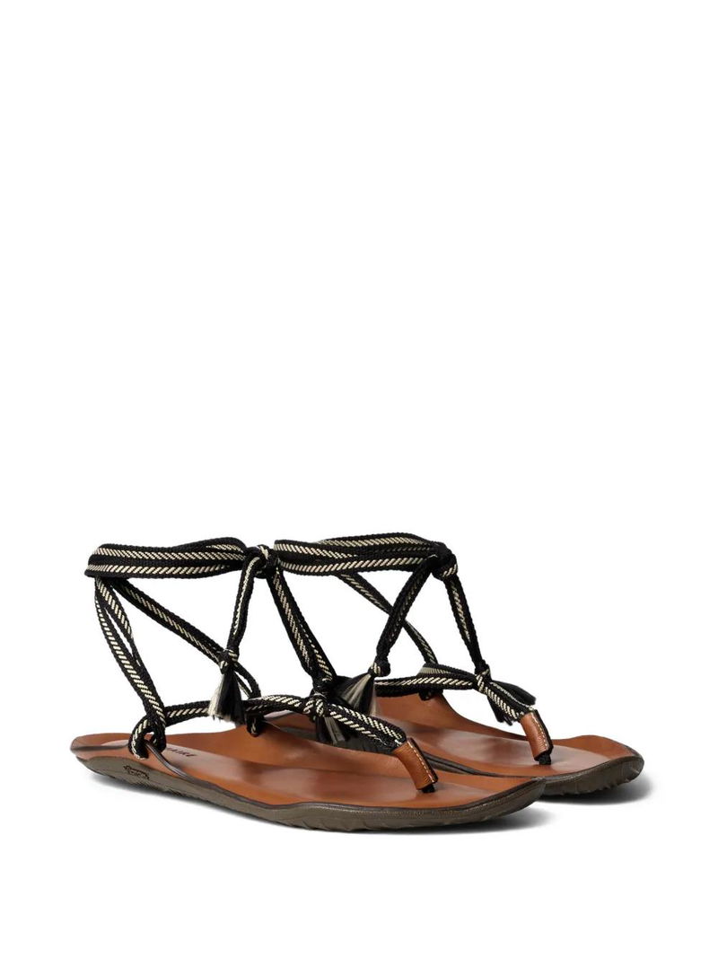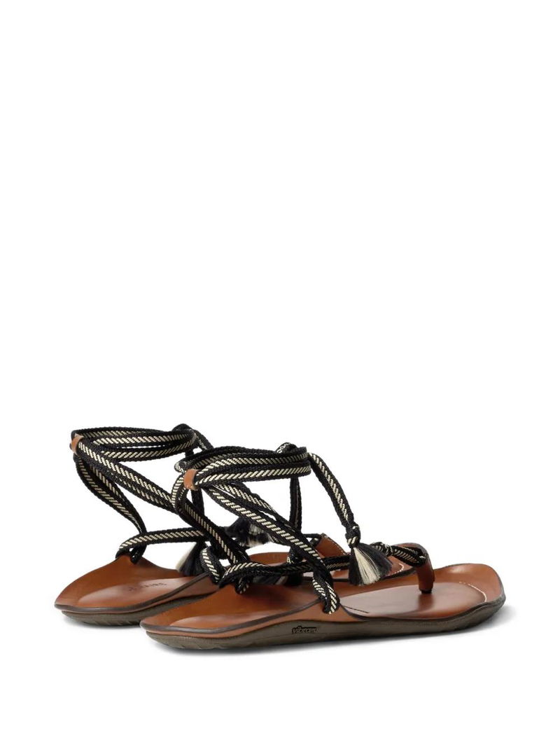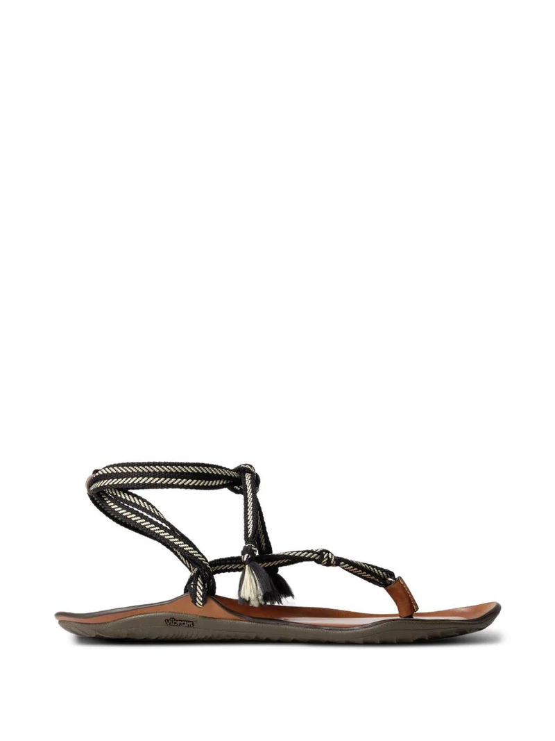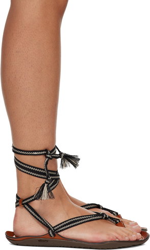 Black and white, bicolor laces, tassel detail, vibram sole, wraparound strap.
