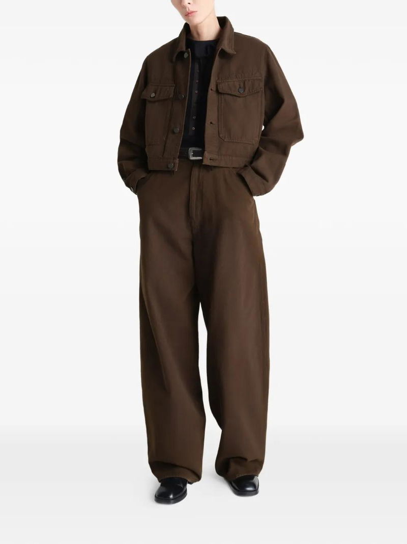 Brown twill texture flap-patch pockets button-fastening cropped-design long-sleeves.