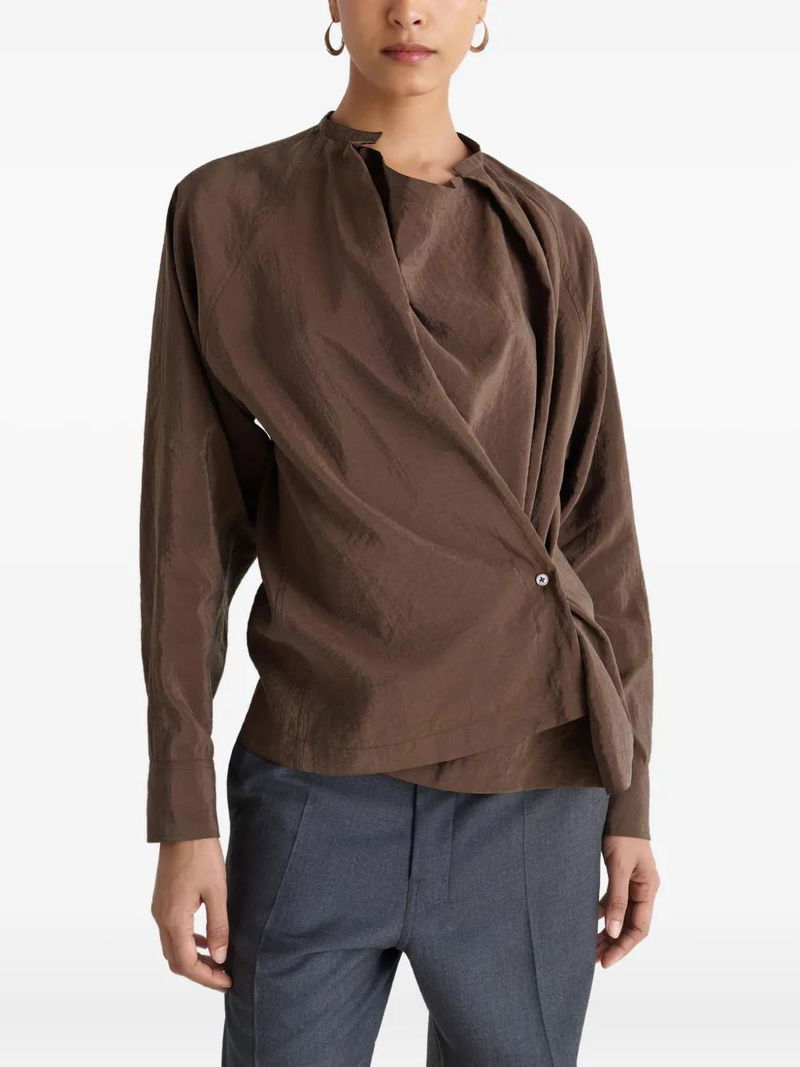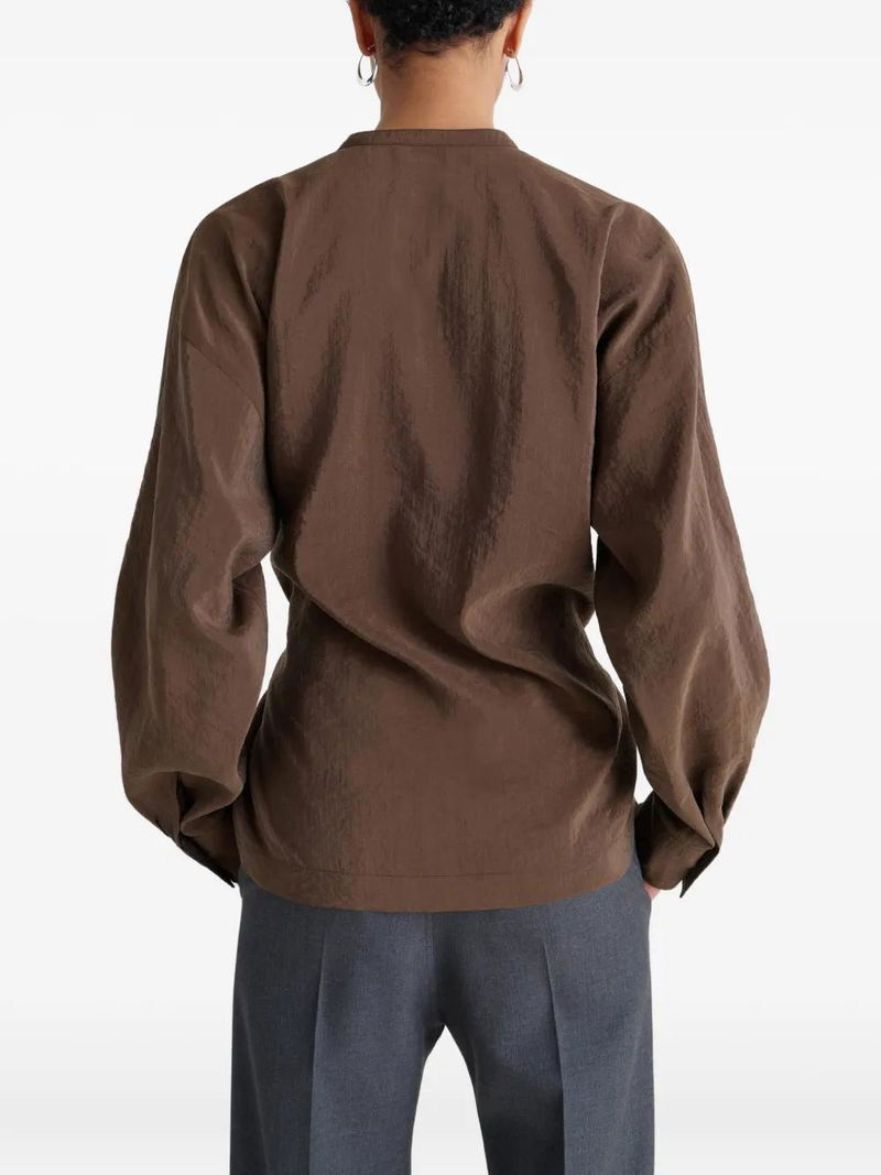 Brown side pleats crew neck buttoned cuffs.