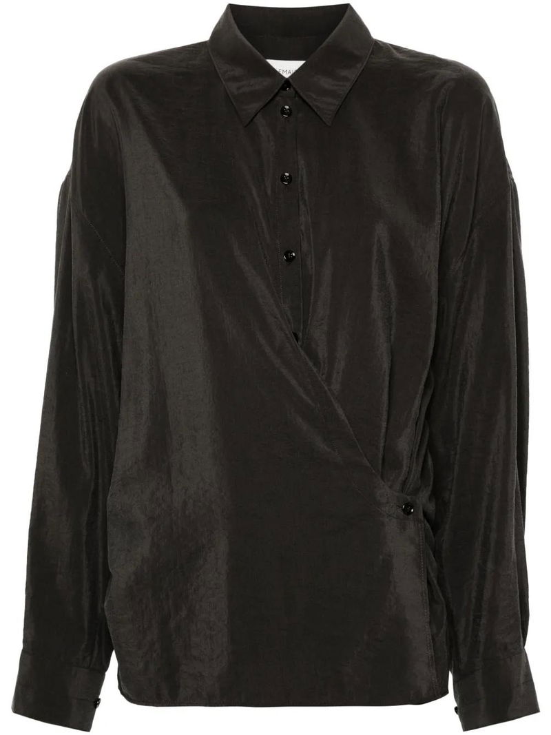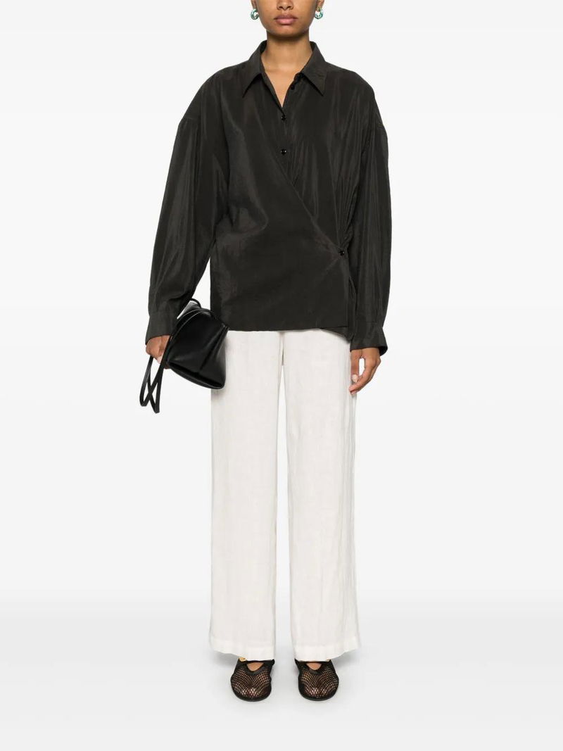 Coffee brown silk blend twist detailing classic collar front button fastening drop shoulder long sleeves with buttoned cuffs straight hem.